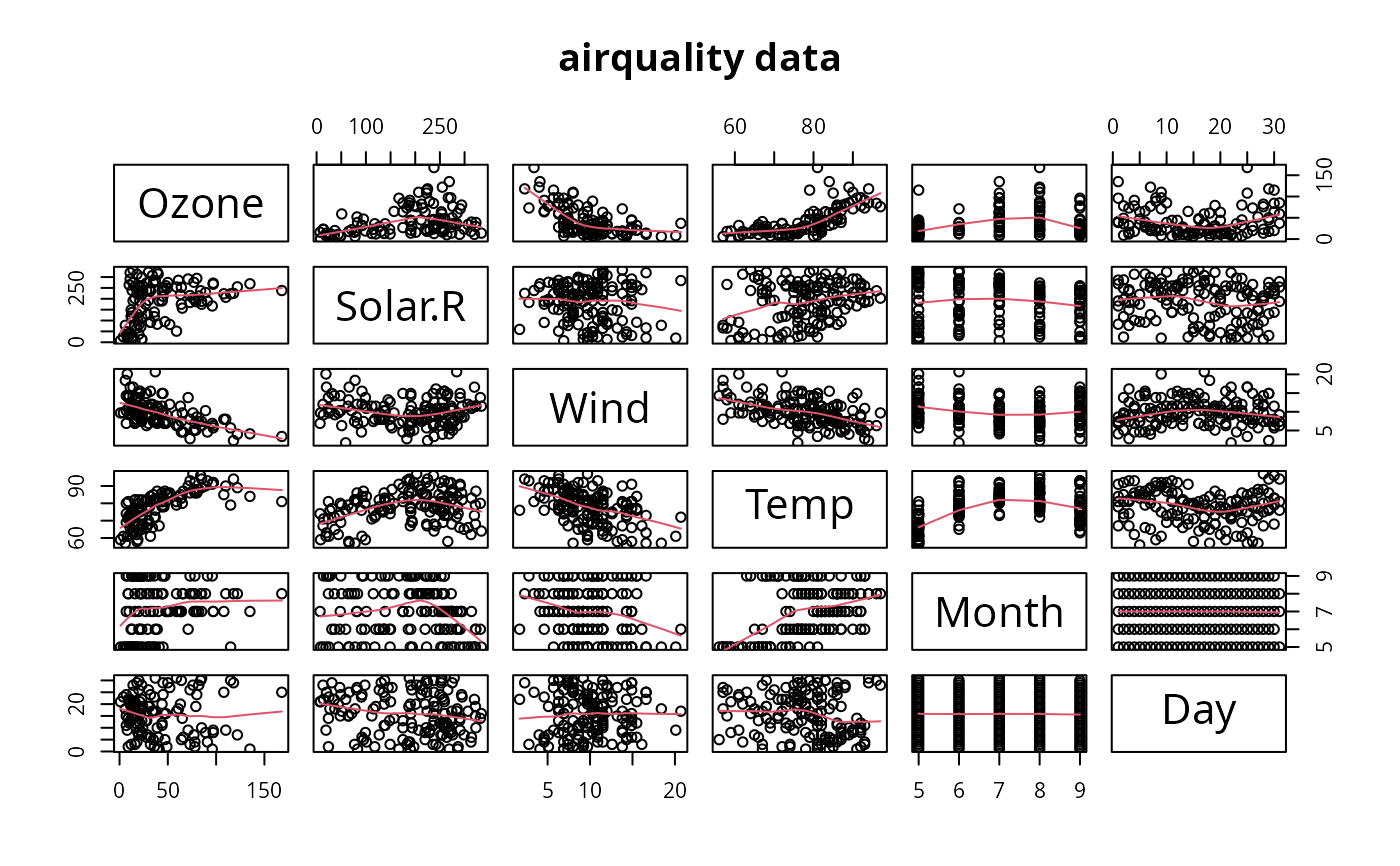 #> arqlty> pairs(airquality, panel = panel.smooth, main = "airquality data")