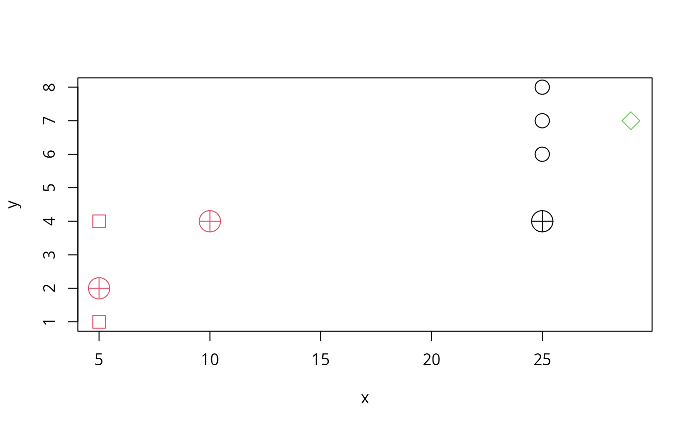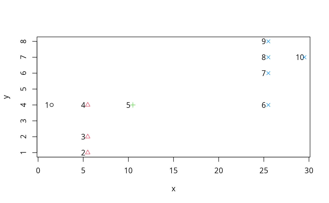 with(d1, points(x+0.5, y, col = cl1P, pch =cl1P))