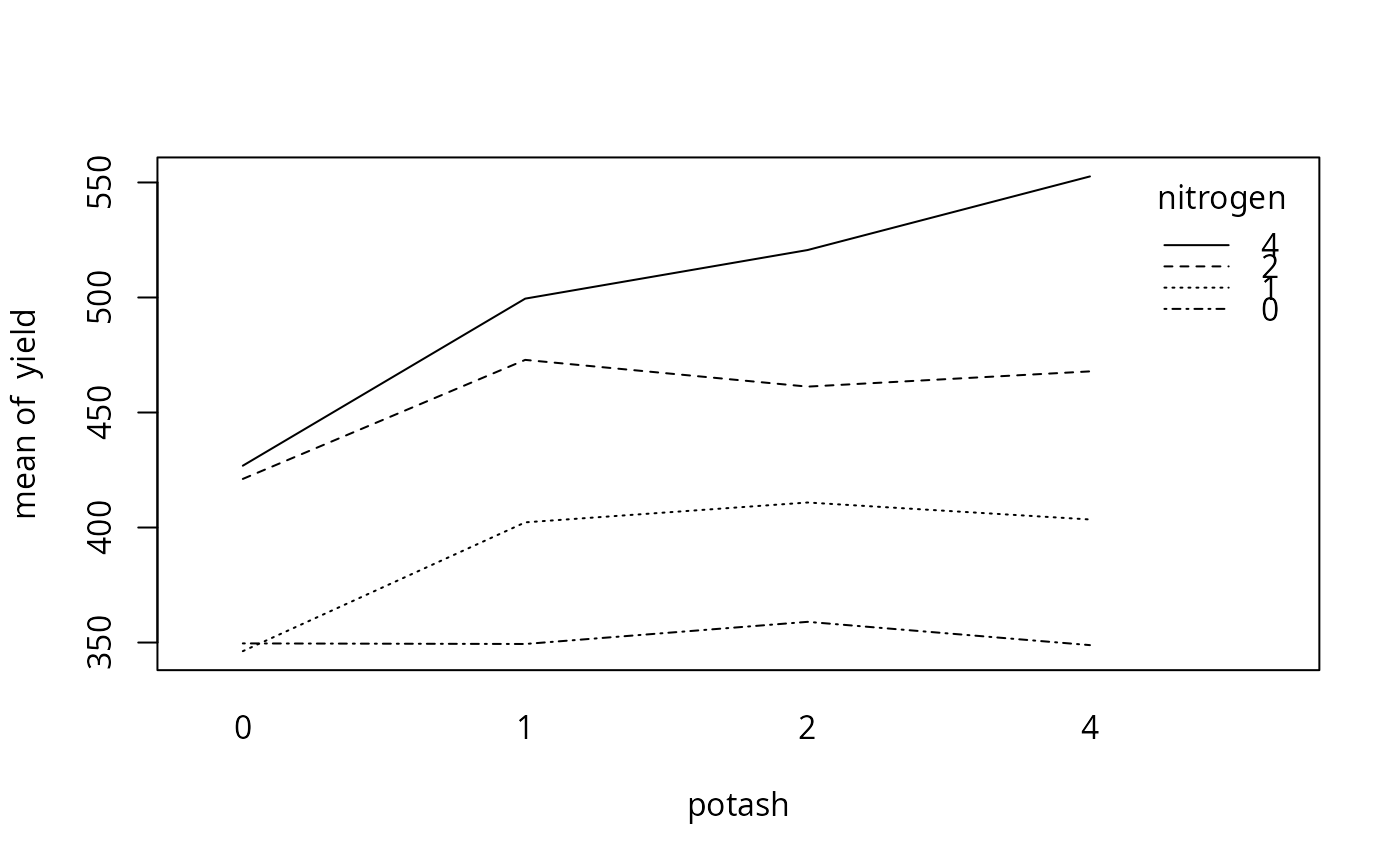 with(potatoes, interaction.plot(potash,nitrogen, response=yield))