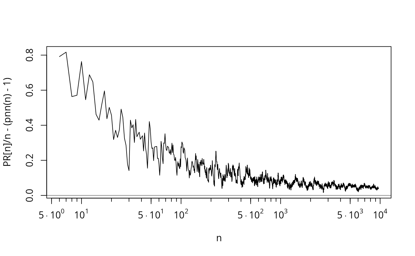 plot(n, PR[n]/n - (pnn(n)-1), type = 'l', cex = 1/8, log="x", xaxt="n")