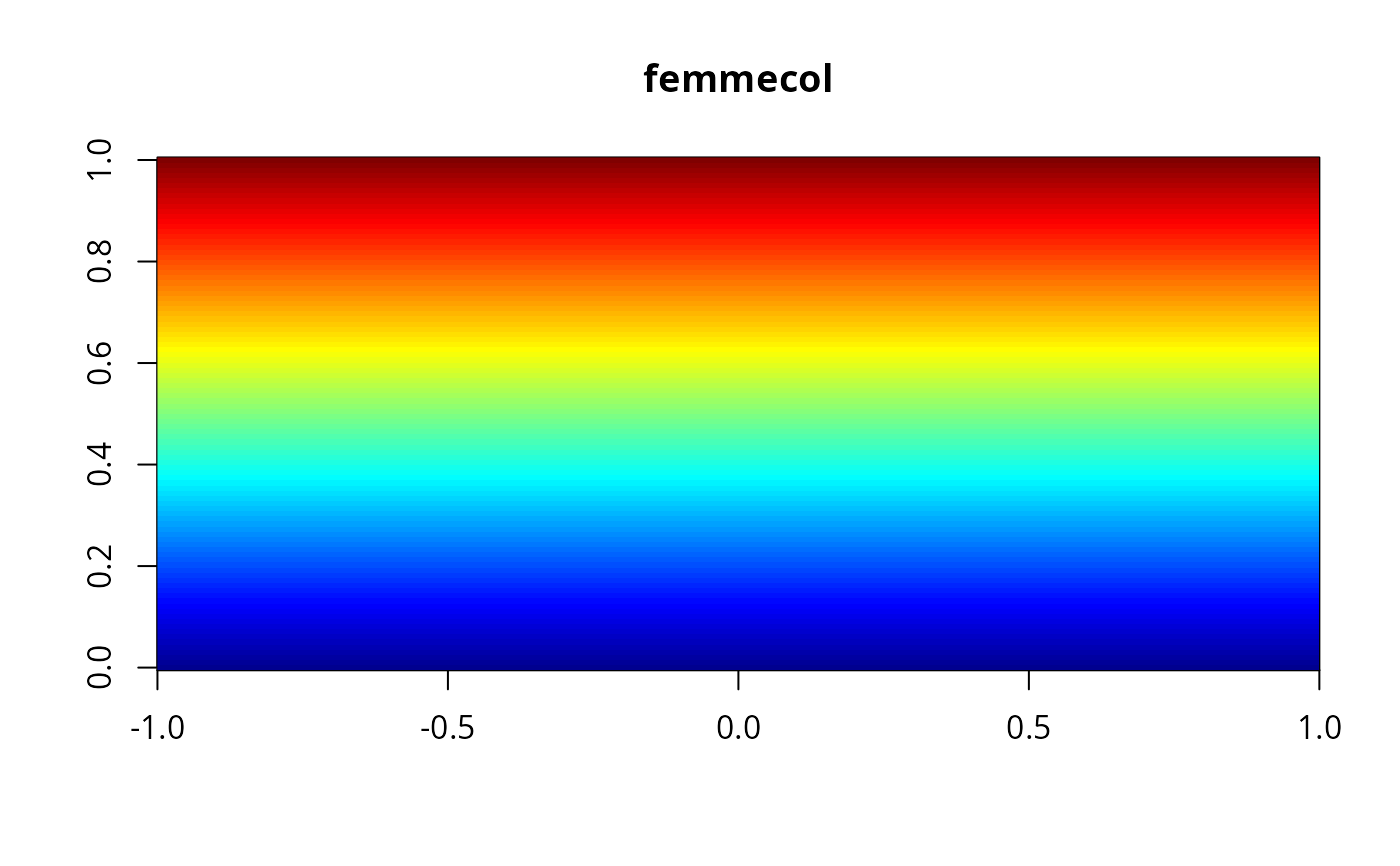 femmecol.RdCreates a vector of (n) contiguous colors (darkblue-blue-cyan-yellow-red-darkred).