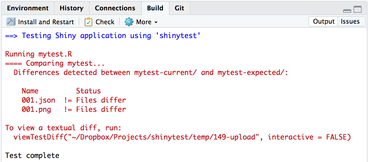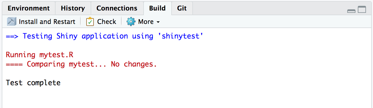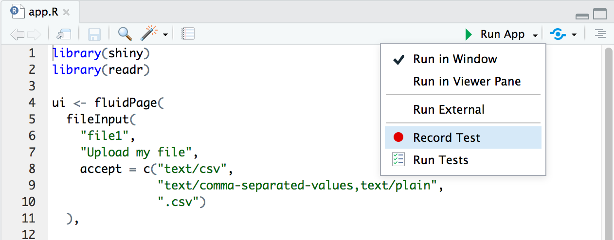 The RStudio IDE provides a graphical interface that make it even easier to create tests for Shiny applications. The GUI provides buttons for running shinytest commands, so that you don’t have to remember them. These features are available in version 1.2 of the IDE and above.