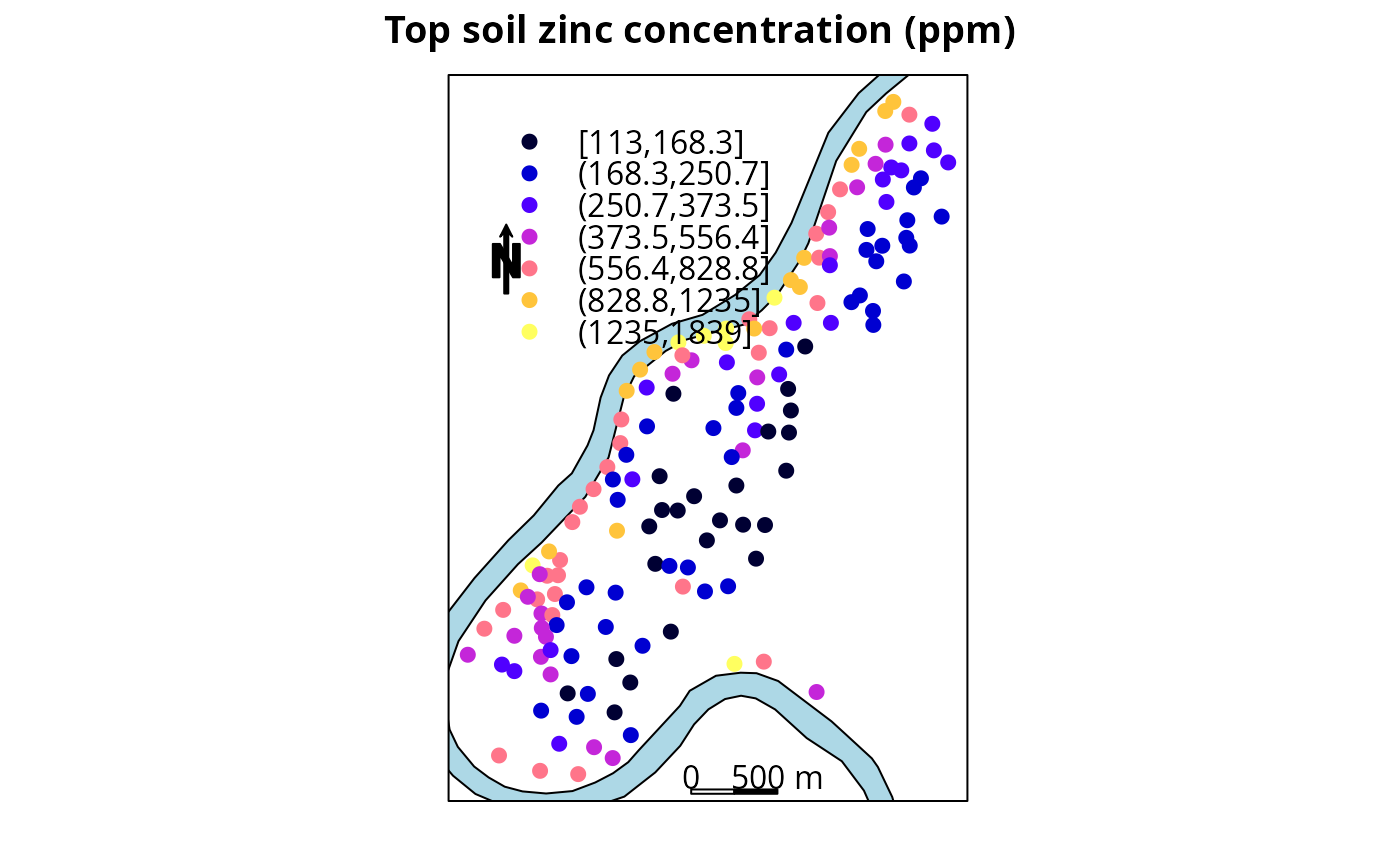 b2 = bubble(meuse, "zinc", maxsize = 1.5, main = "zinc concentrations (ppm)",