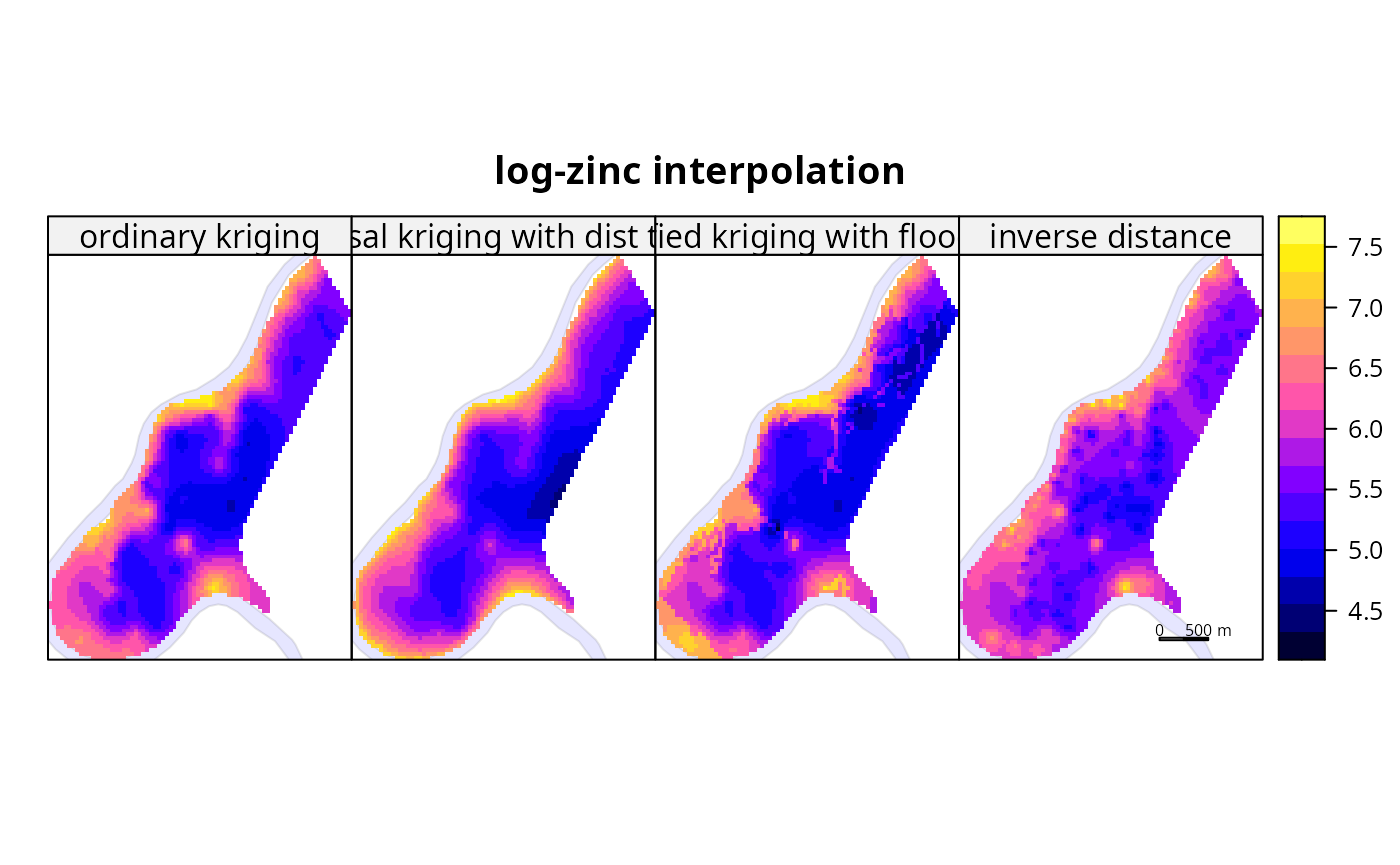 names.attr = c("ordinary kriging", "universal kriging with dist to river",