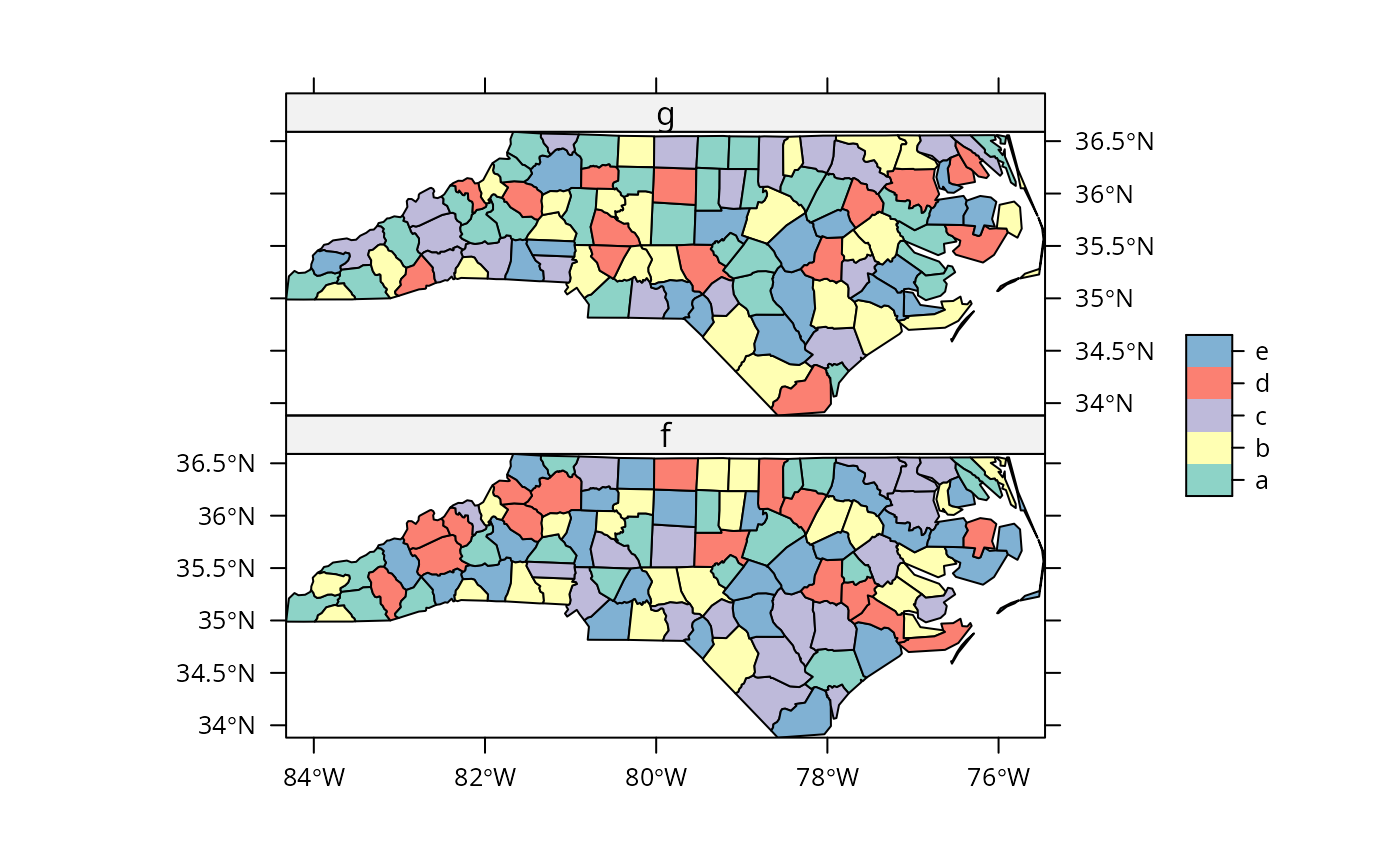 spplot(nc, c("f","g"), col.regions=brewer.pal(5, "Set3"), scales=list(draw = TRUE))