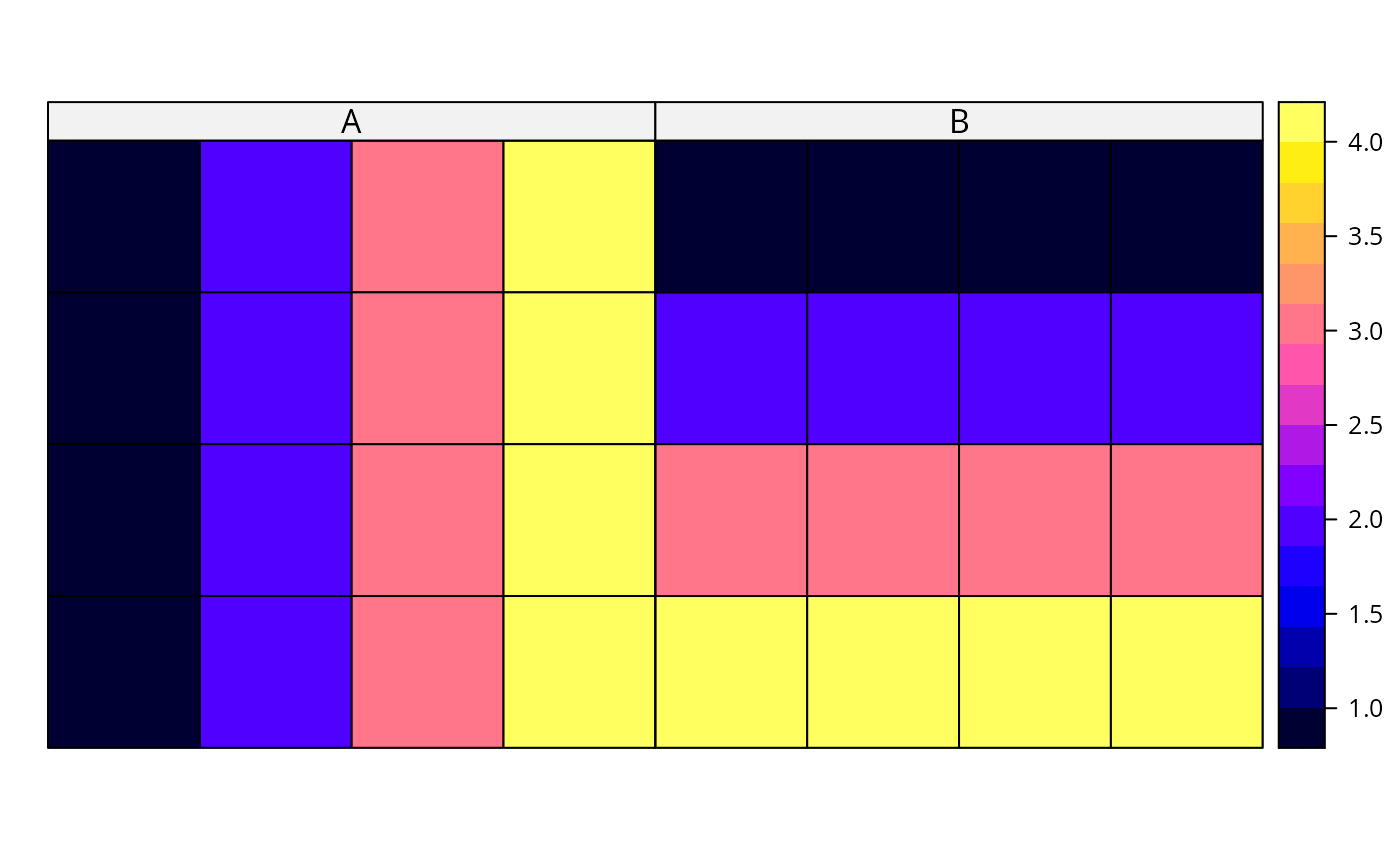 trdata <- data.frame(A=rep(c(1,2,3,4), 4), B=rep(c(1,2,3,4), each=4),
