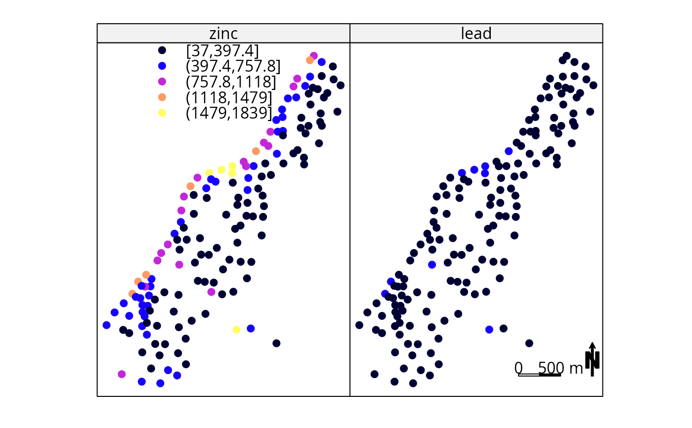 spplot(meuse, c("zinc", "lead"), sp.layout=list(l2,l3,l4,l5, which = 2),