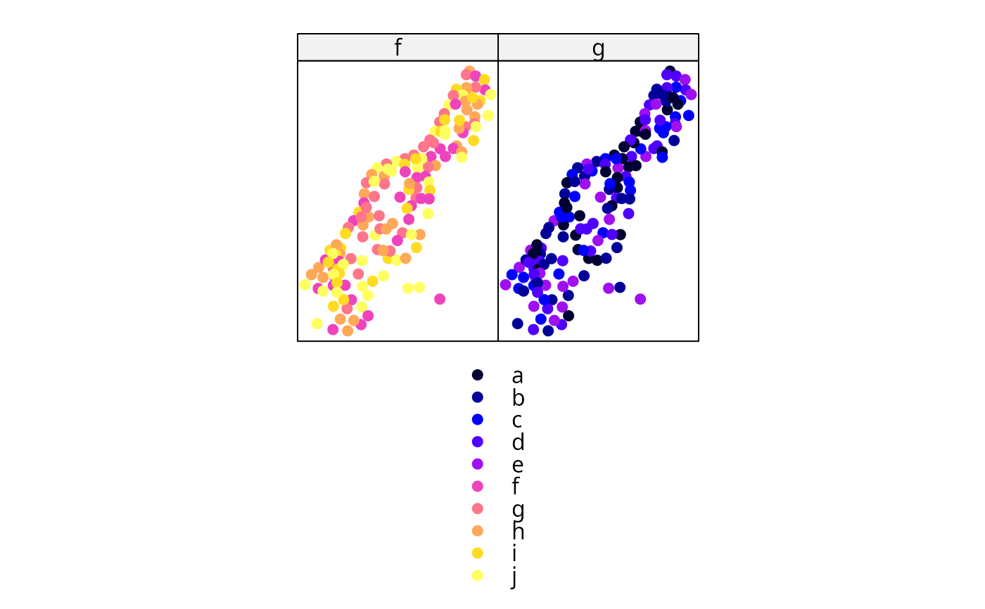 spplot(meuse, c("f","g"), col.regions=bpy.colors(10))
