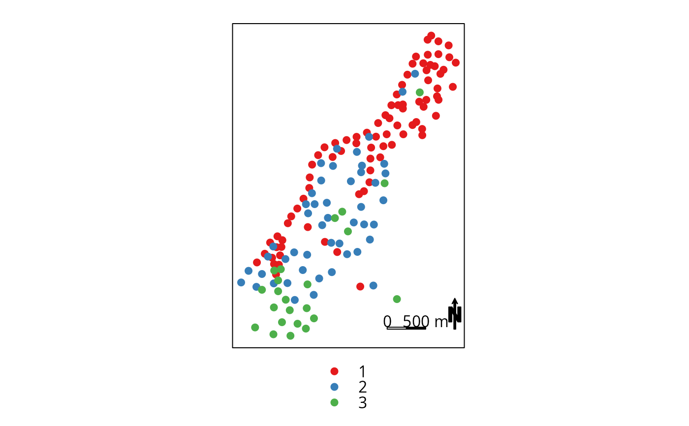 spplot(meuse, c("ffreq"), sp.layout=list(l2,l3,l4,l5),