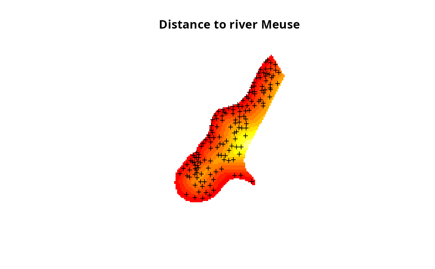 image(meuse.grid["dist"], main = "Distance to river Meuse",