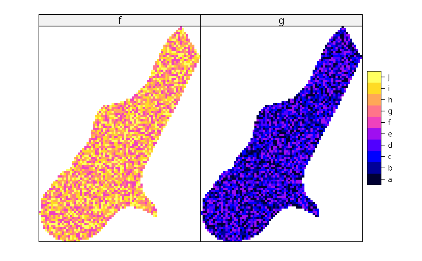 spplot(meuse.grid, c("f","g"), col.regions=bpy.colors(10))