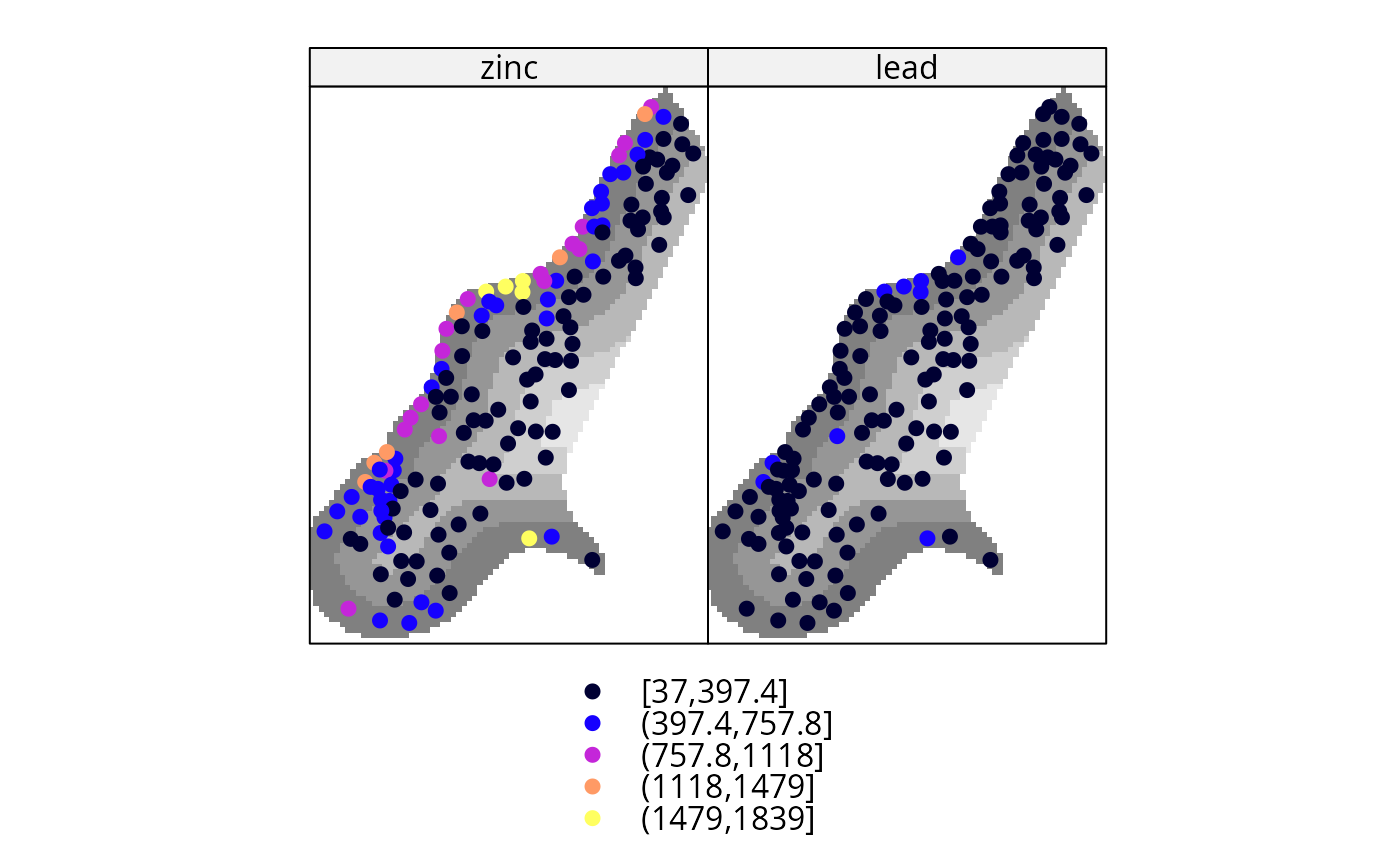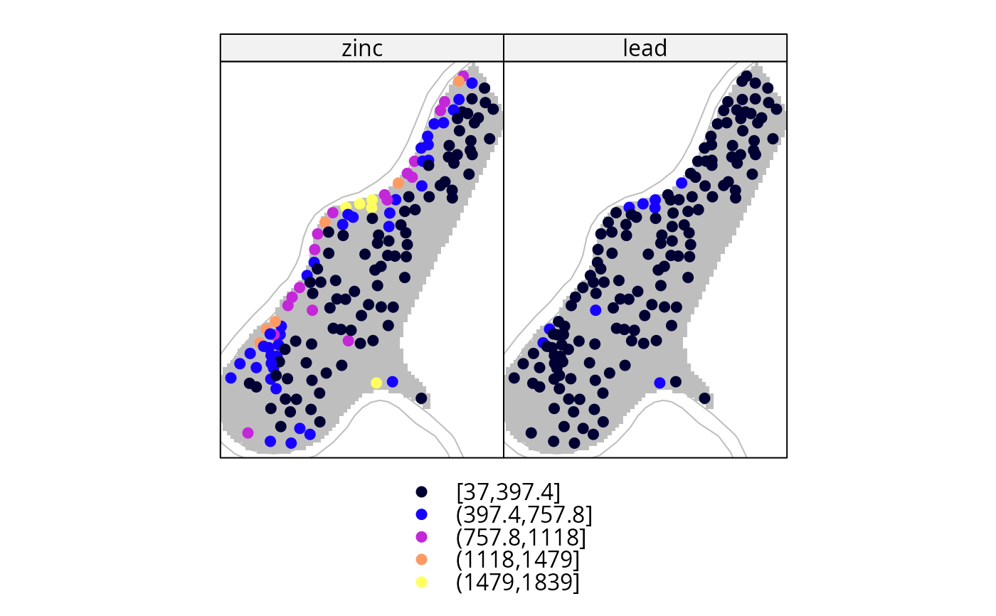 spplot(meuse, c("zinc", "lead"), sp.layout=list(l2,l3,l4,l5, which = 2),