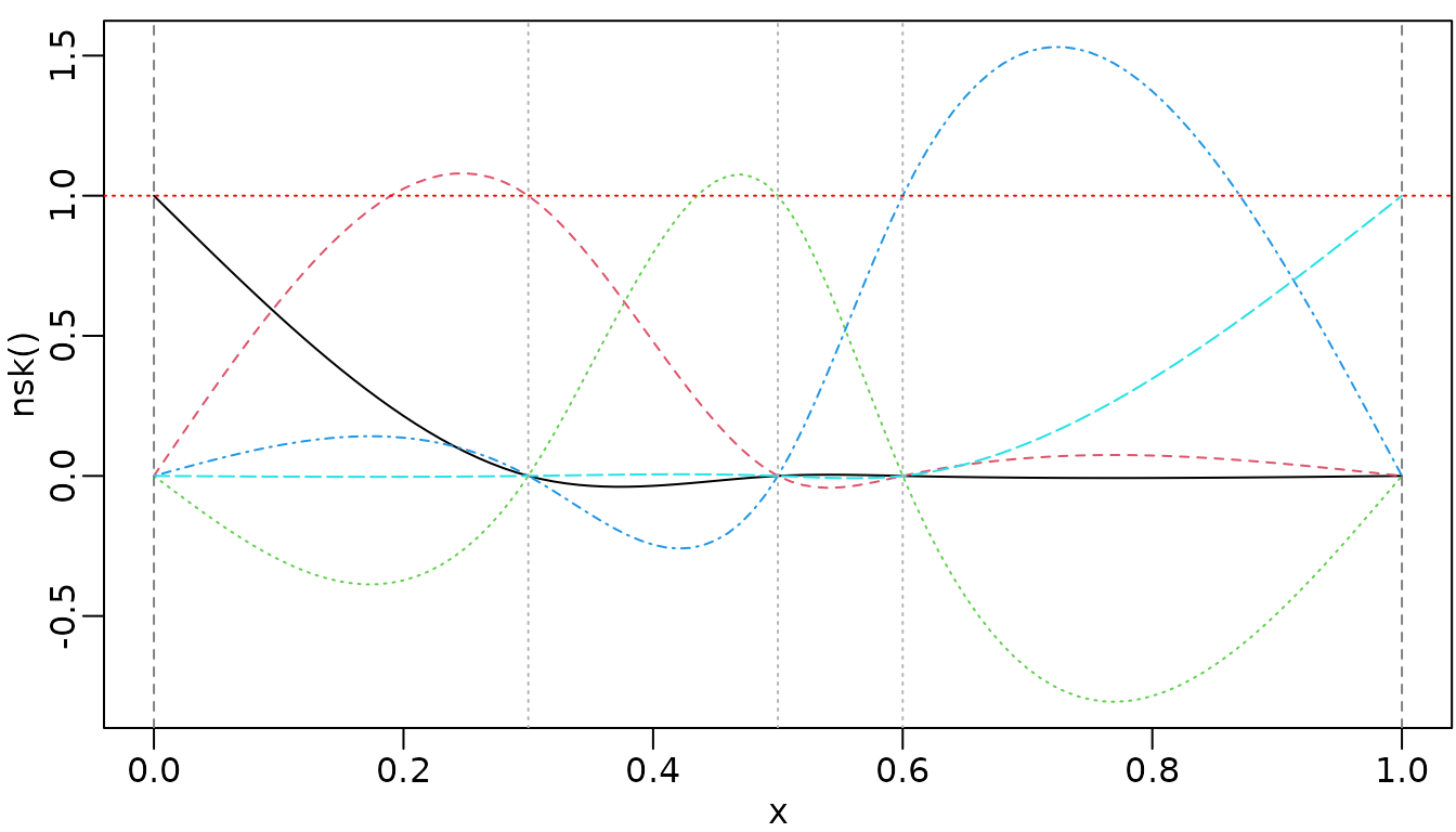 plot(nskMat, ylab = "nsk()", mark_knots = "all", coef = beta)