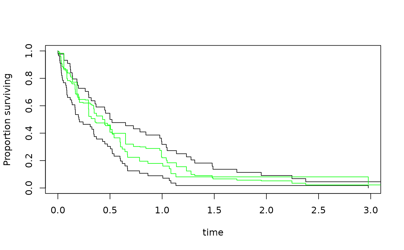 s2<-svykm(Surv(time,status>0)~group, design=des)