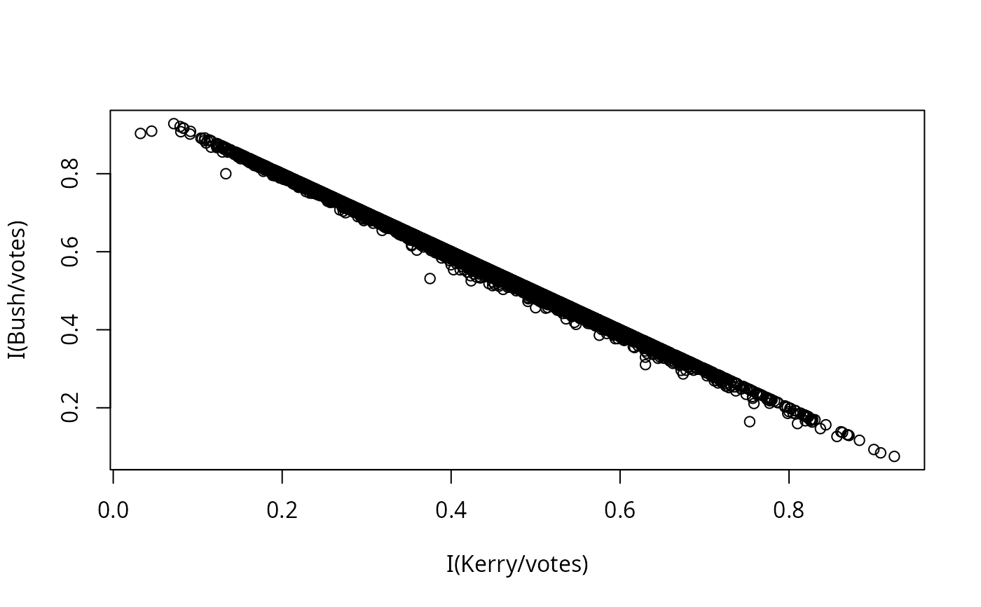 plot(I(Bush/votes)~I(Kerry/votes), data=election)