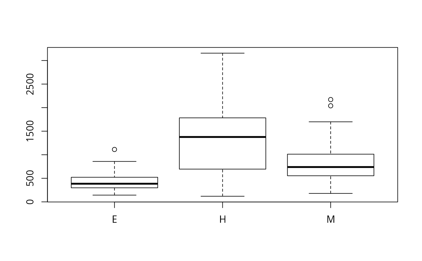svyboxplot(enroll~stype,dstrat,all.outliers=TRUE)