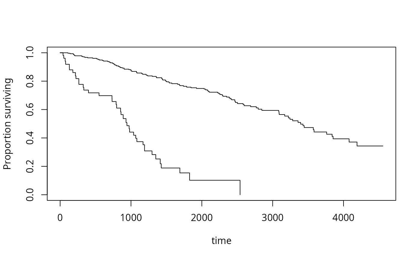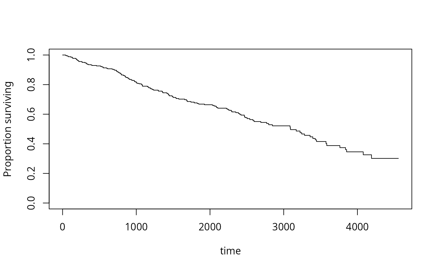 plot(x,xlab="time",ylab="Proportion surviving",