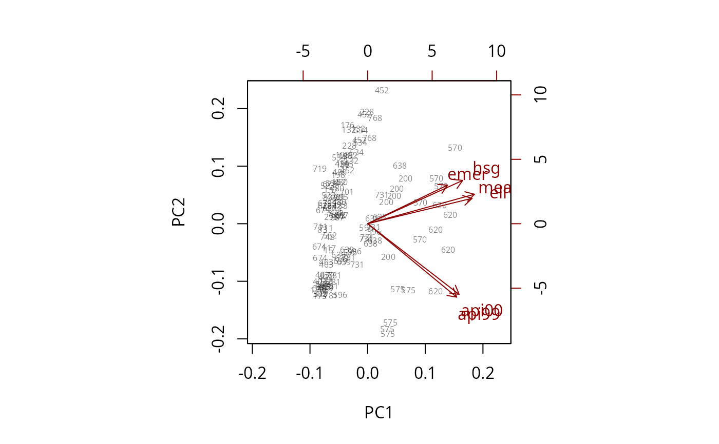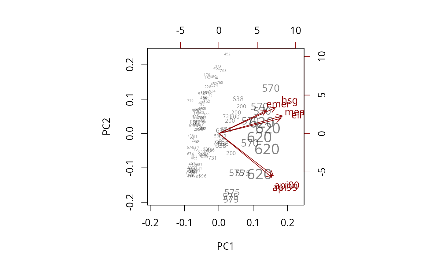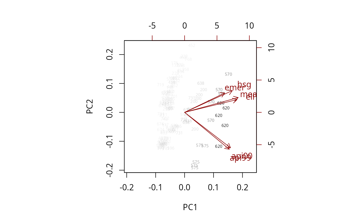 biplot(x, cols=c("black","darkred"),xlabs=NULL,