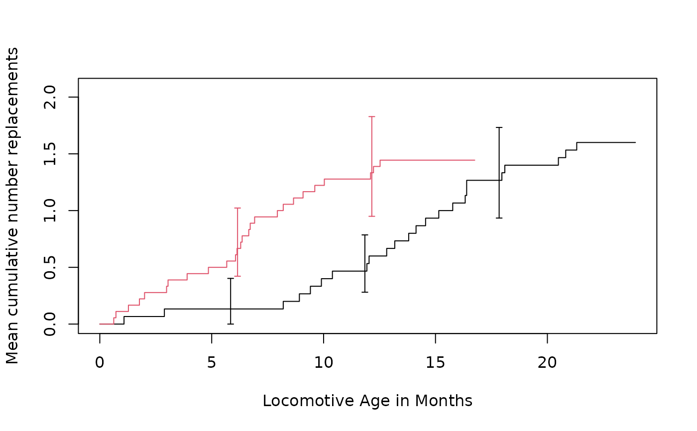 xlab="Locomotive Age in Months", ylab="Mean cumulative number replacements")