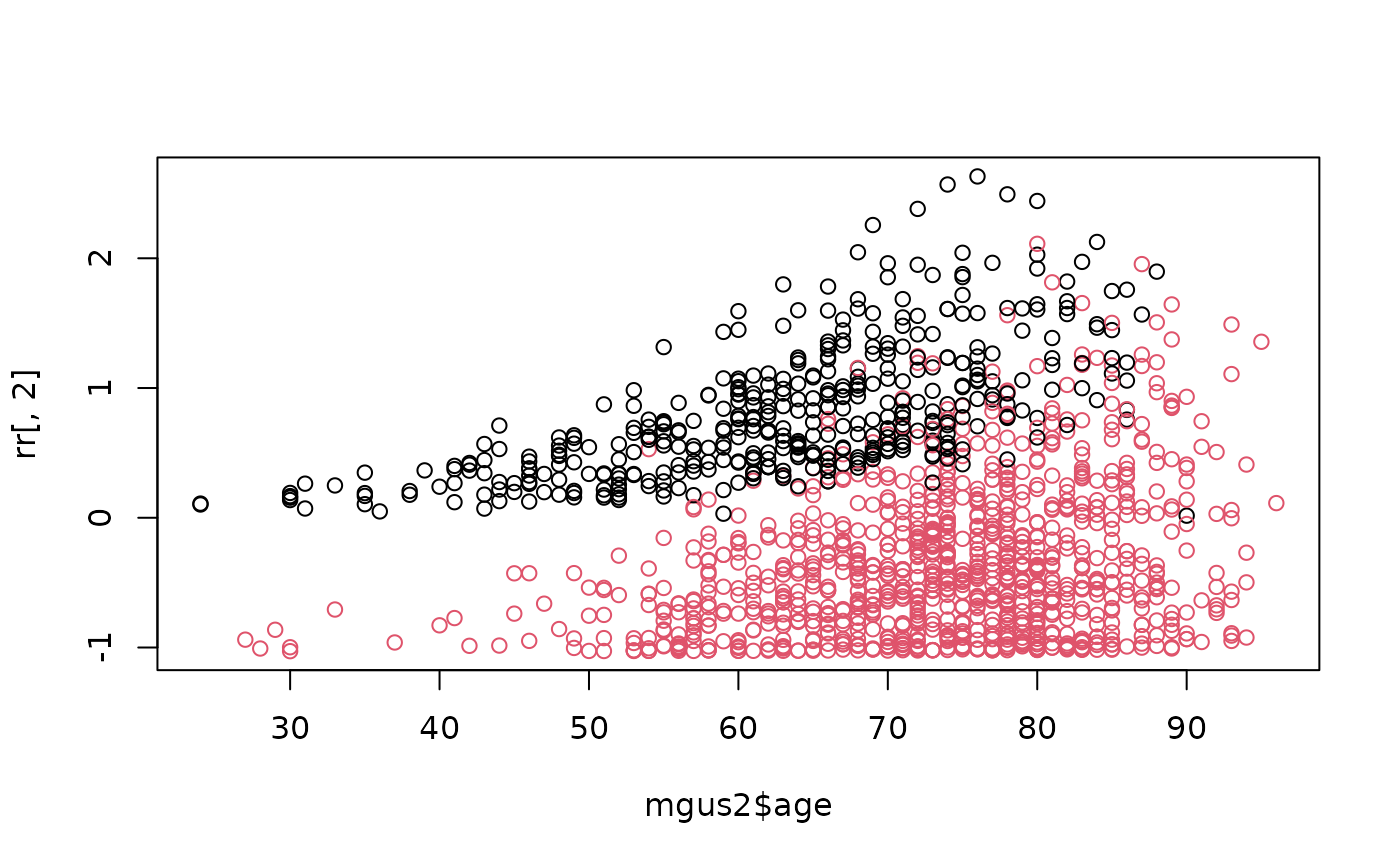 plot(mgus2$age, rr[,2], col= (1+mgus2$death)) # ldresp