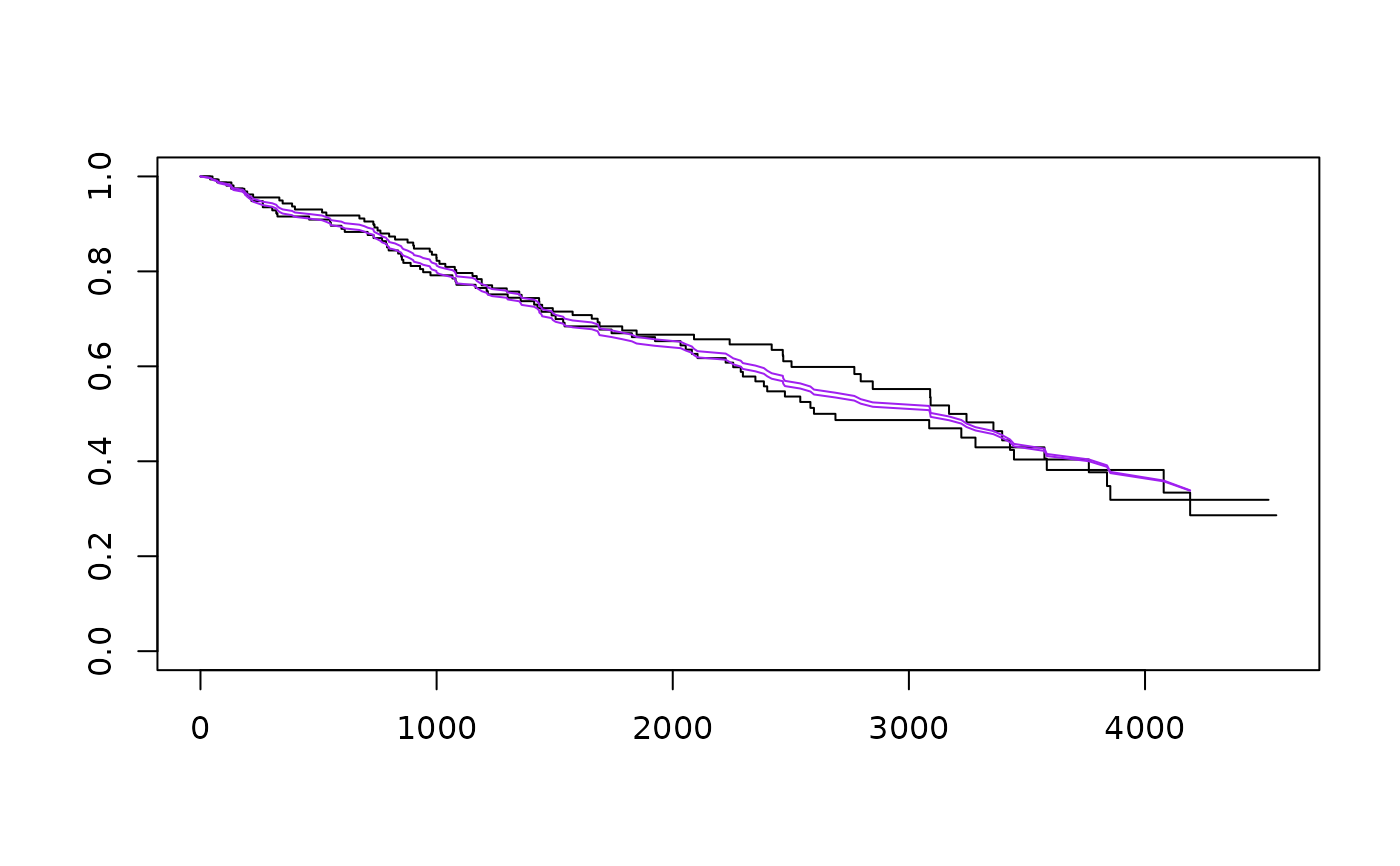 lines(survexp( ~ trt, ratetable=pfit, data=pbc), col='purple')