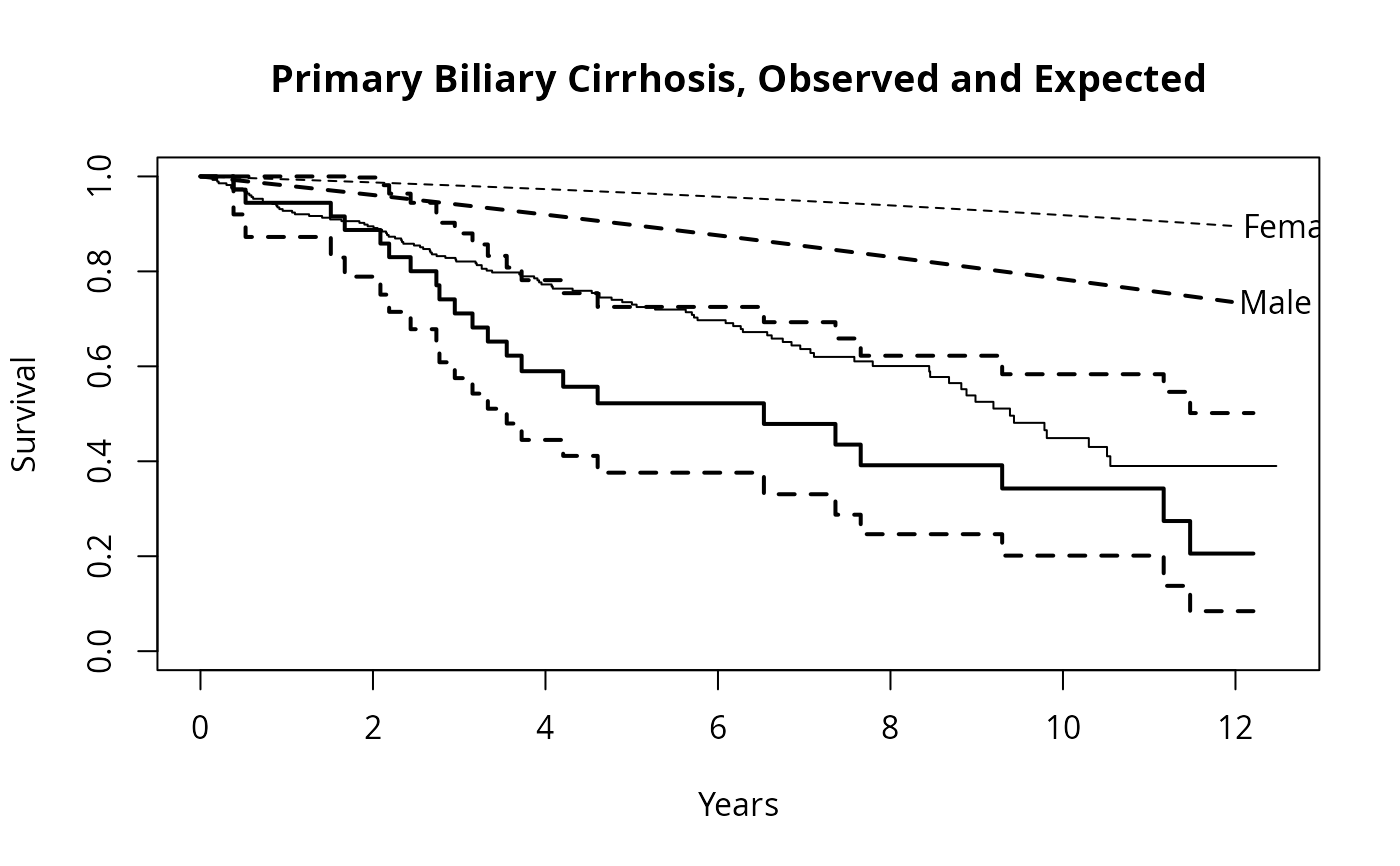 title(main="Primary Biliary Cirrhosis, Observed and Expected")