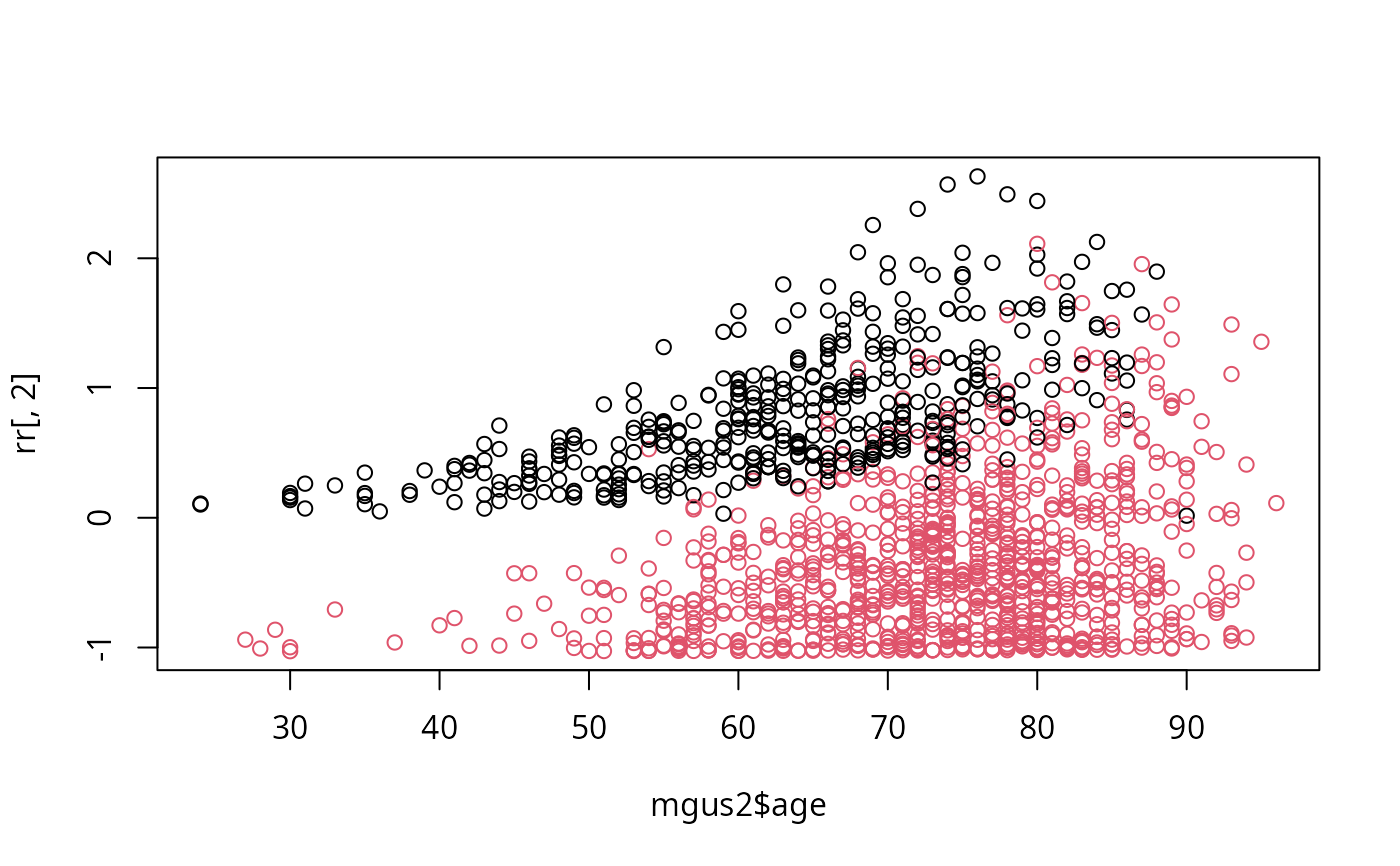 plot(mgus2$age, rr[,2], col= (1+mgus2$death)) # ldresp