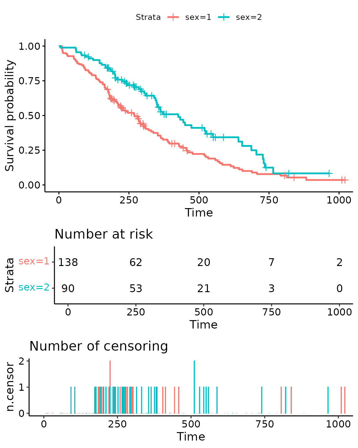ggsurvplot(fit, data = lung, risk.table = TRUE, ncensor.plot = TRUE)