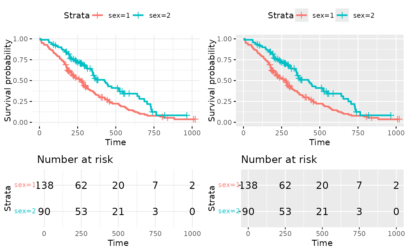 splots[[2]] <- ggsurvplot(fit, data = lung, risk.table = TRUE, ggtheme = theme_grey())