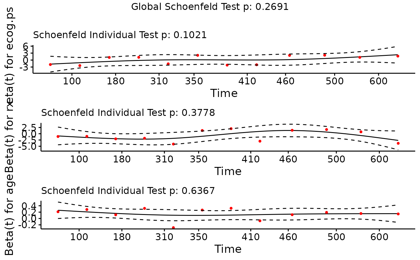 ggcoxzph(cox.zph.fit, var = c("ecog.ps", "rx", "age"), font.main = 12)