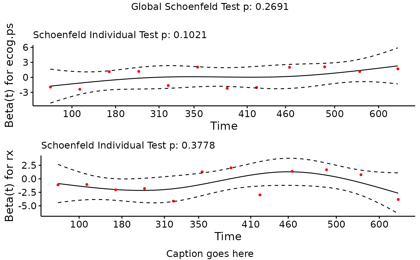 ggcoxzph(cox.zph.fit, var = c("ecog.ps", "rx"), font.main = 12, caption = "Caption goes here")