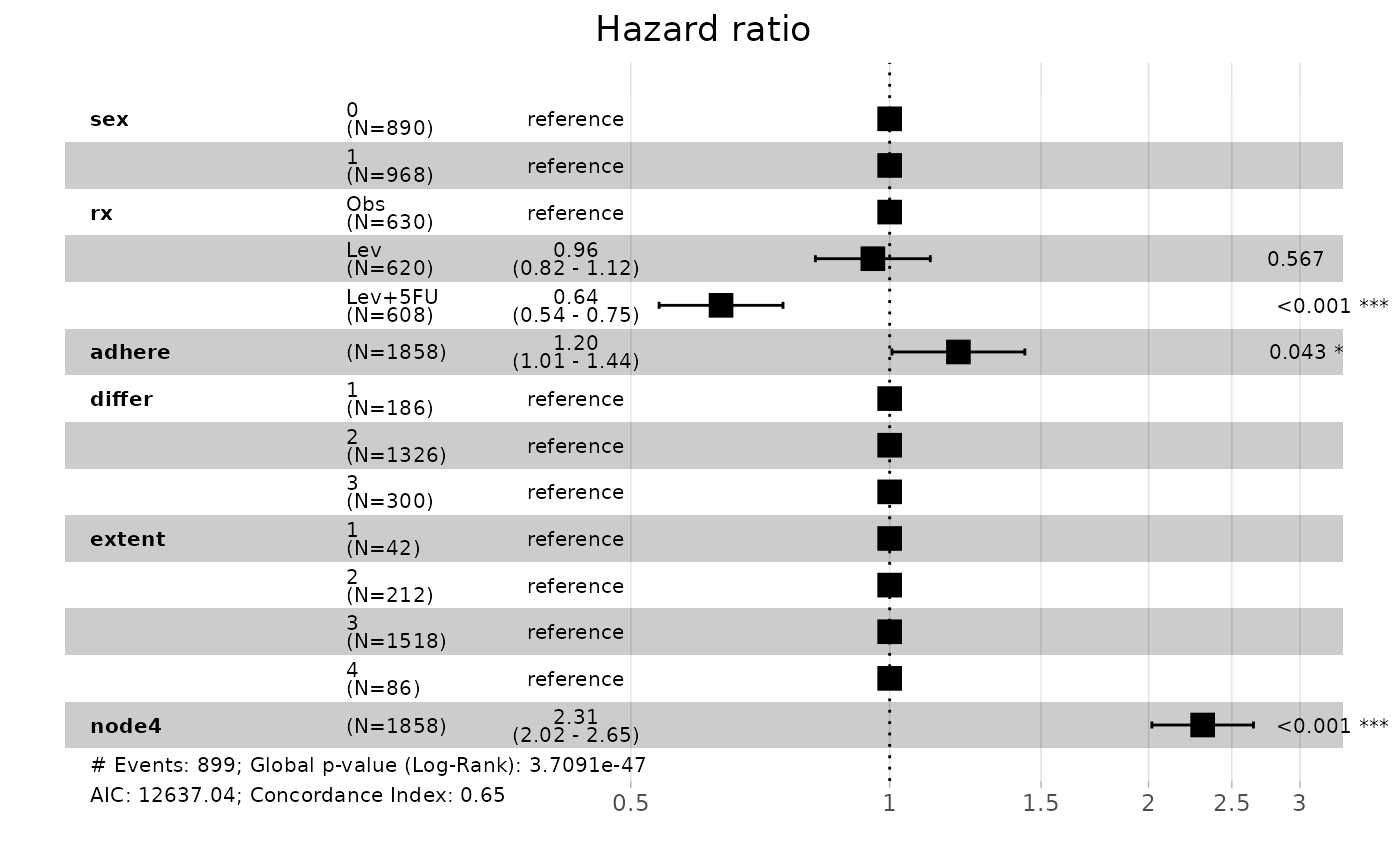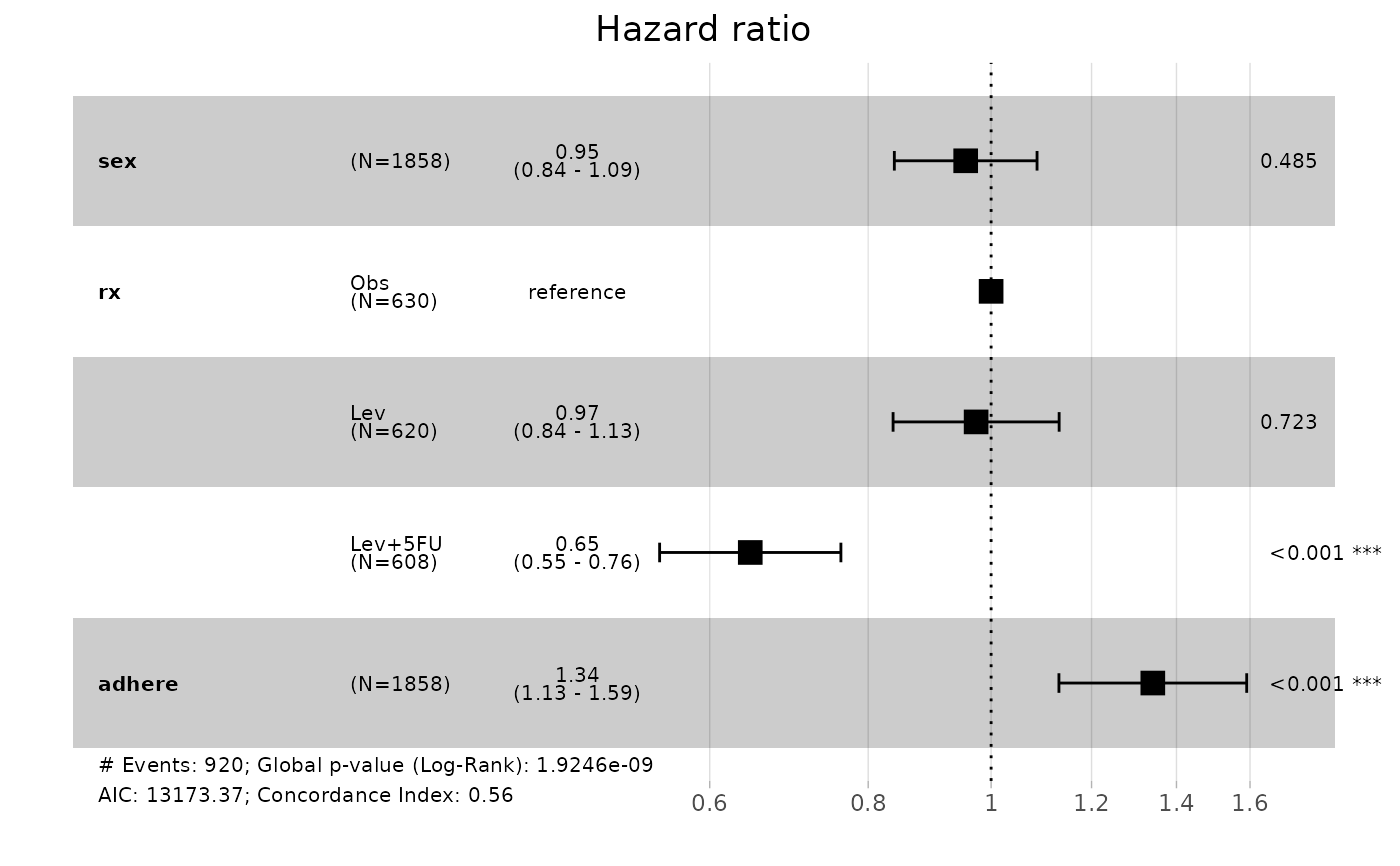 model <- coxph( Surv(time, status) ~ sex + rx + adhere,