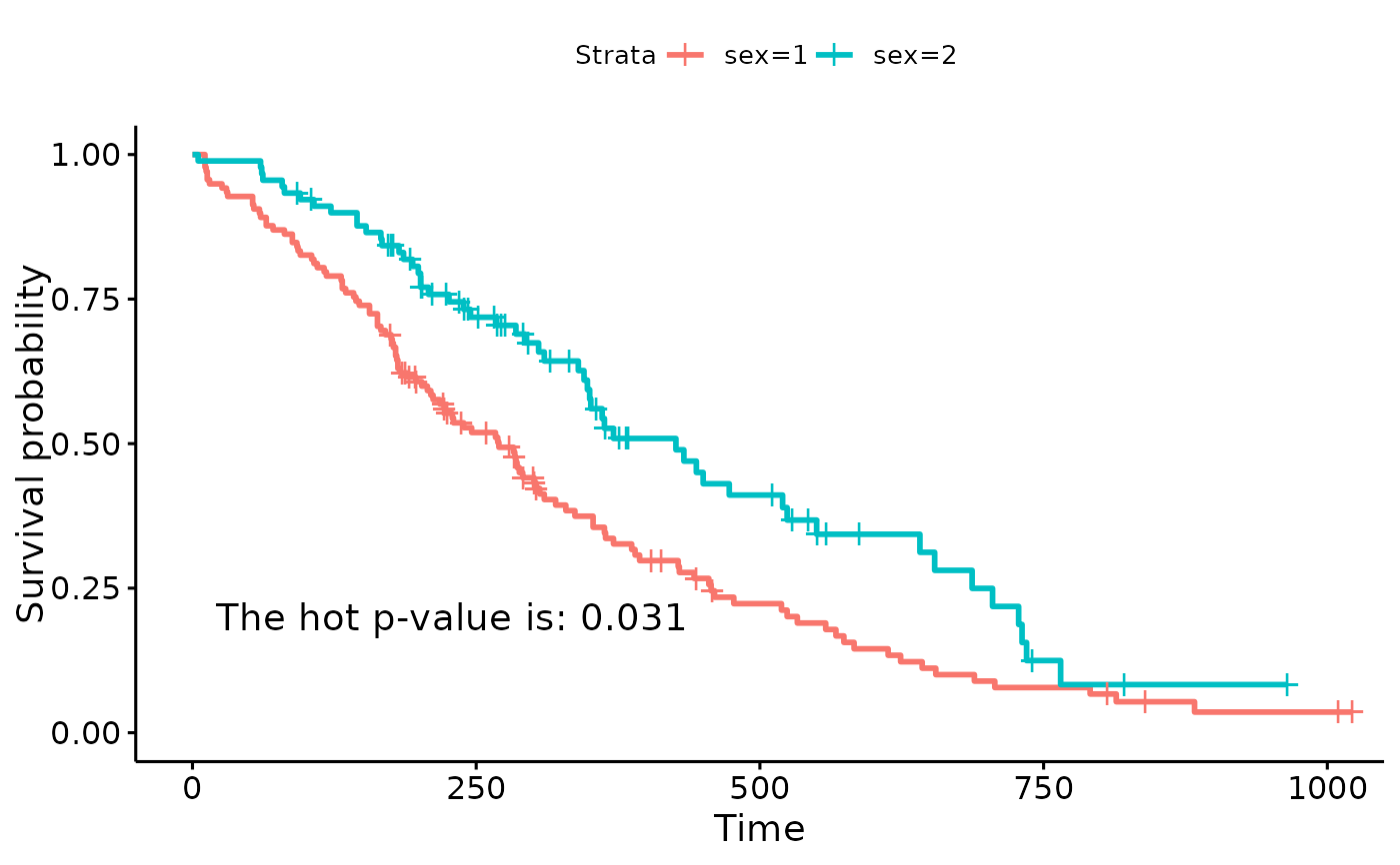 ggsurvplot(fit, data = lung, pval = "The hot p-value is: 0.031")