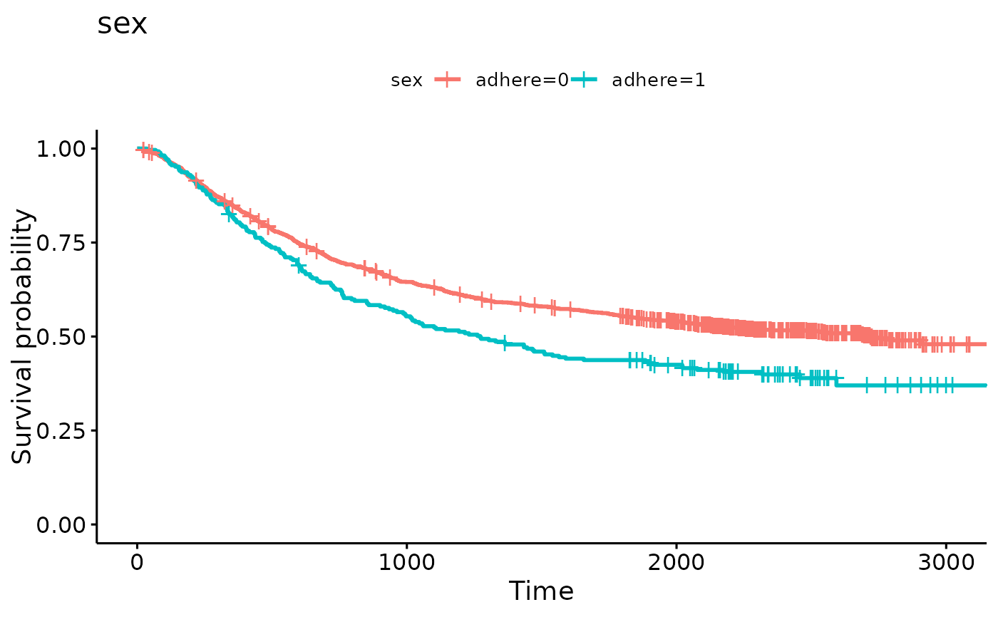 f1 <- survfit(Surv(time, status) ~ adhere, data = colon)