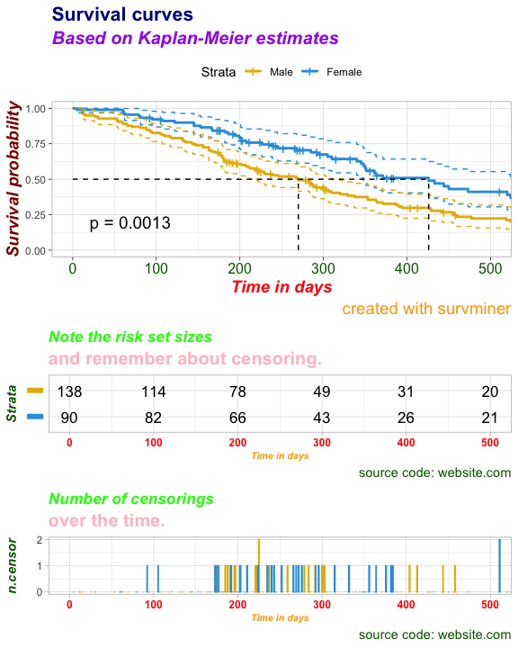 Note that, additional arguments are available to customize the main title, axis labels, the font style, axis limits, legends and the number at risk table.