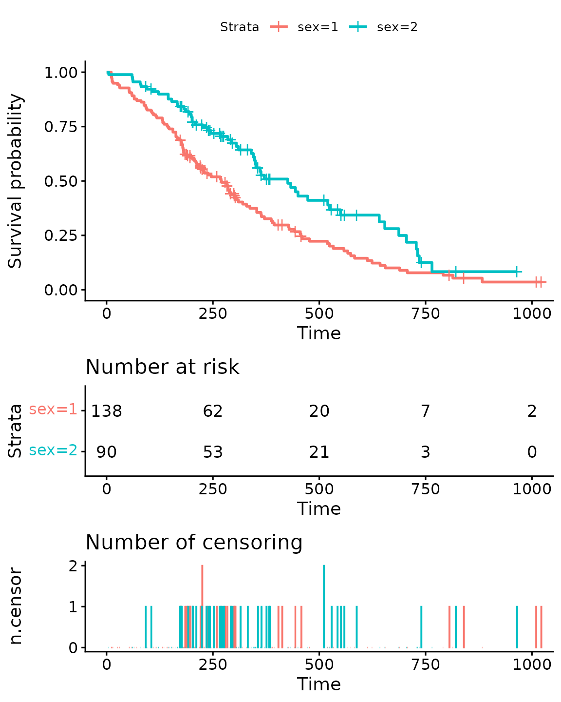 ggsurvplot(fit, data = lung, risk.table = TRUE, ncensor.plot = TRUE)