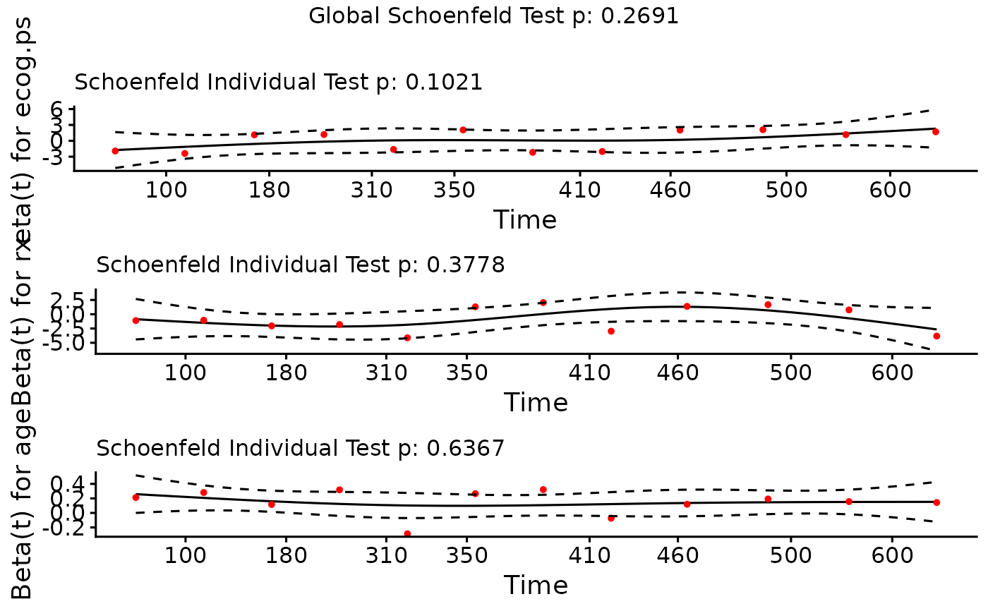 ggcoxzph(cox.zph.fit, var = c("ecog.ps", "rx", "age"), font.main = 12)