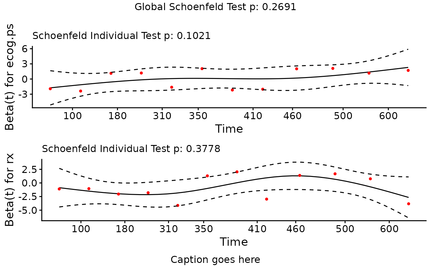 ggcoxzph(cox.zph.fit, var = c("ecog.ps", "rx"), font.main = 12, caption = "Caption goes here")