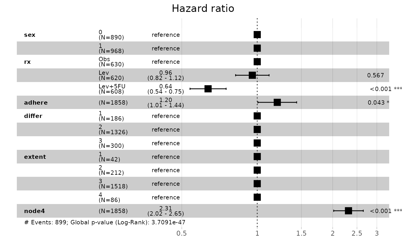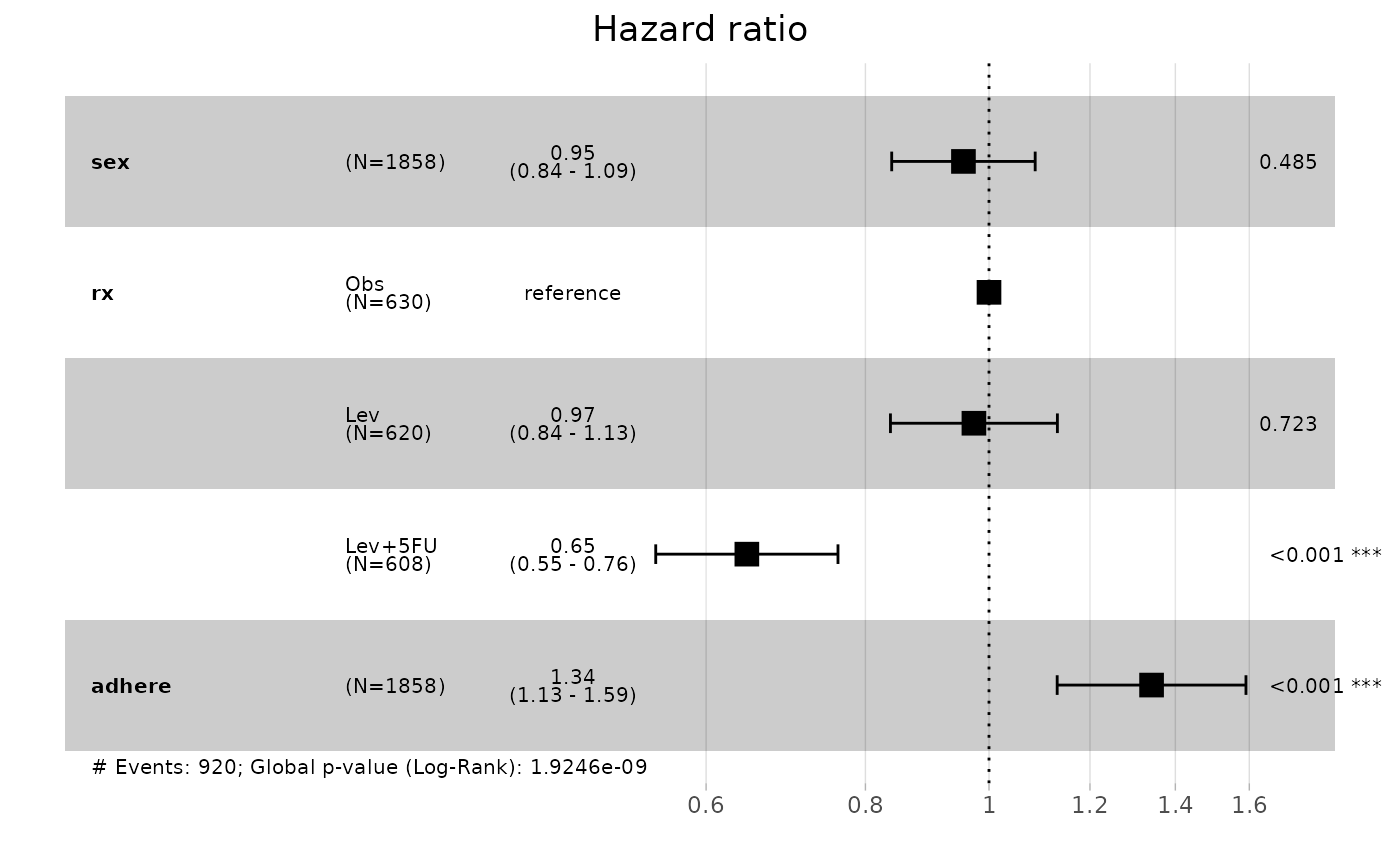 model <- coxph( Surv(time, status) ~ sex + rx + adhere,