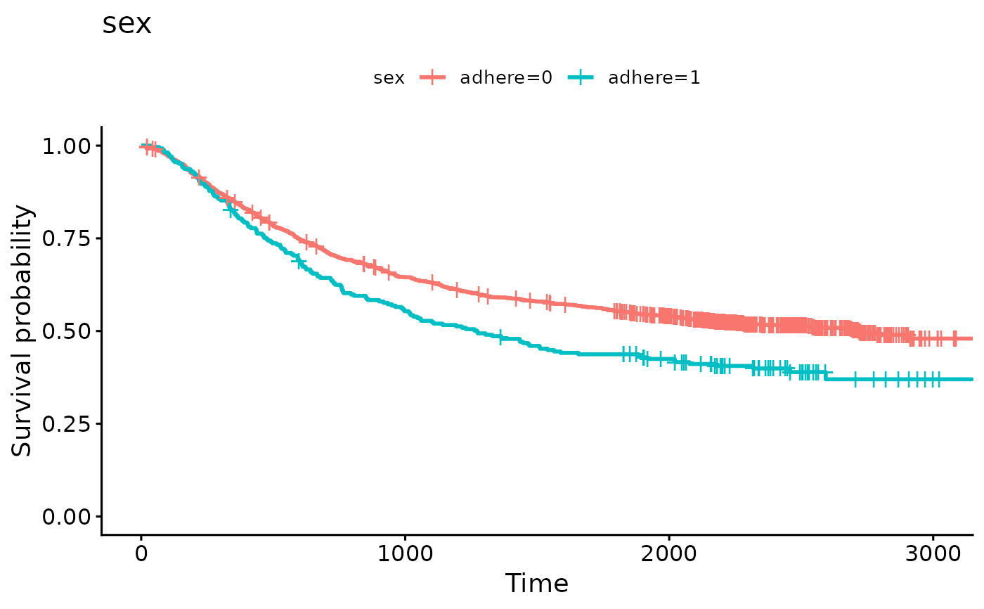 f1 <- survfit(Surv(time, status) ~ adhere, data = colon)