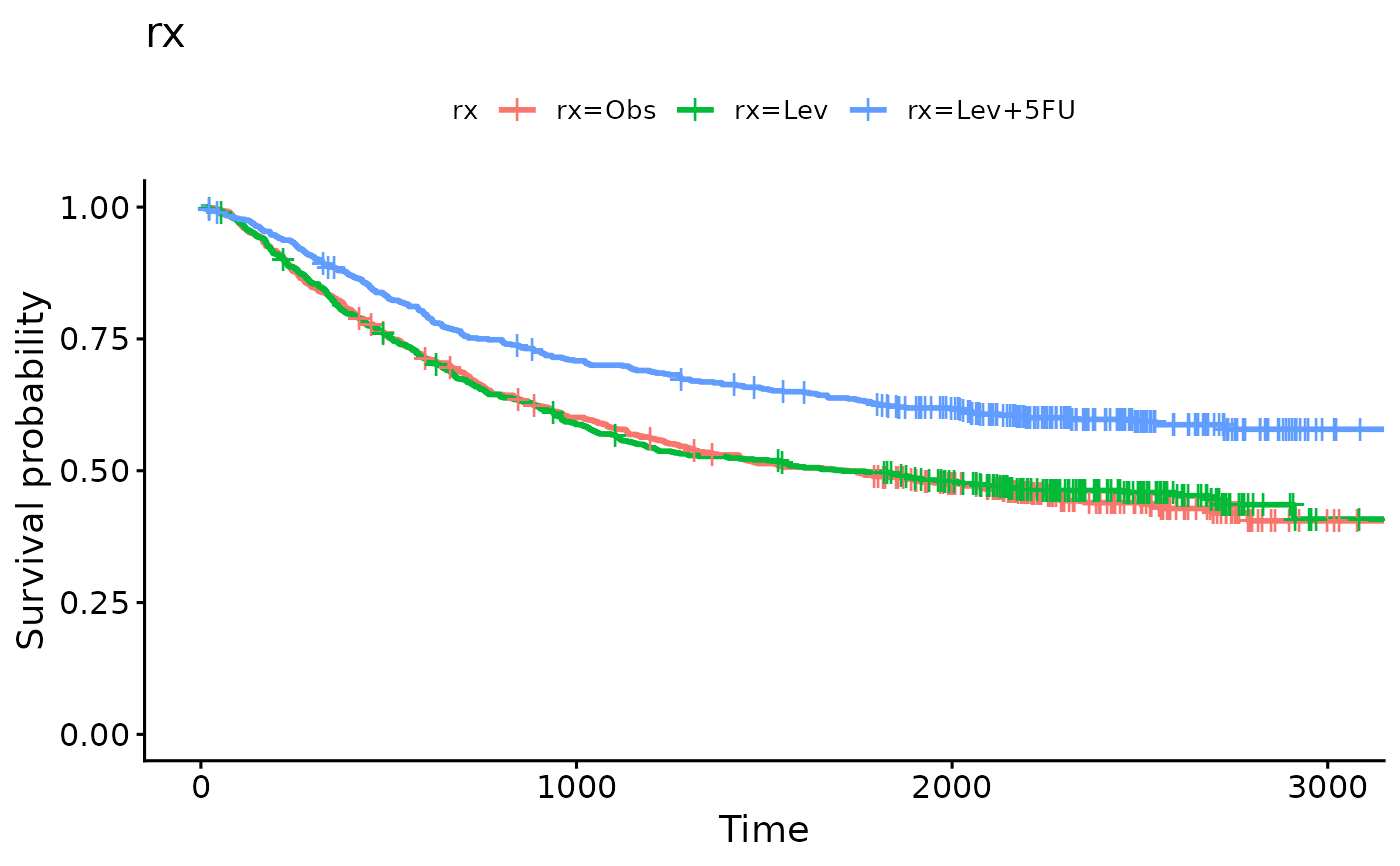 f2 <- survfit(Surv(time, status) ~ rx, data = colon)