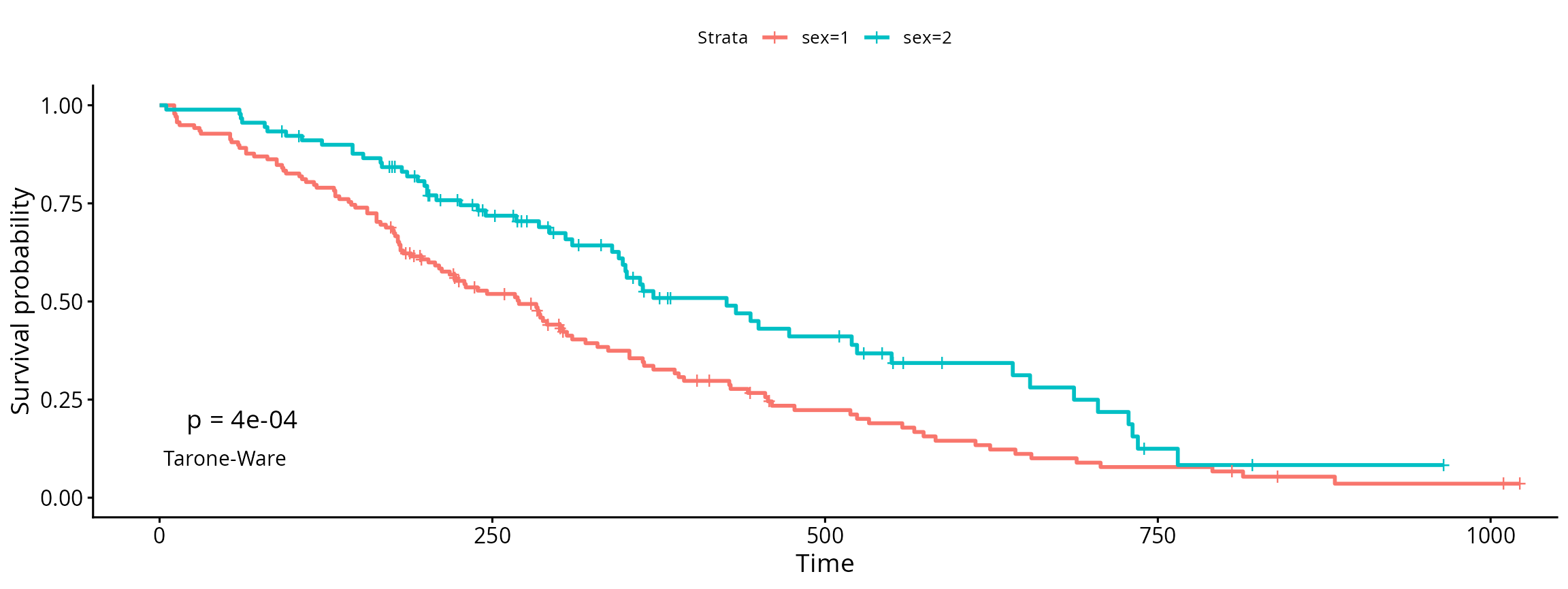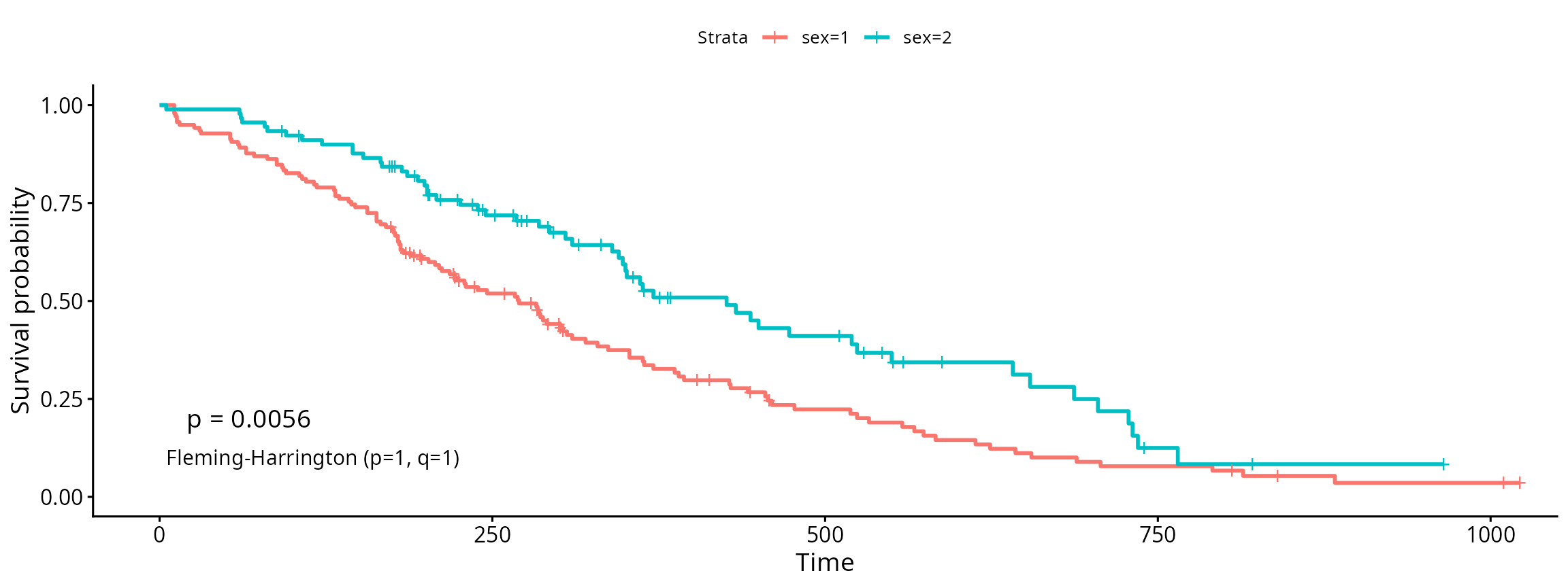 fit <- survfit(Surv(time, status) ~ sex, data = lung)After preparing a functionality for this GitHub’s issue Other tests than log-rank for testing survival curves and Log-rank test for trend we are now able to compute p-values for various Log-rank test in survminer package. Let as see below examples on executing all possible tests.