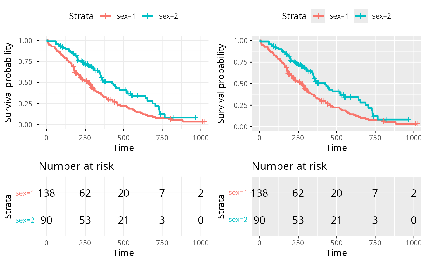 splots[[2]] <- ggsurvplot(fit, data = lung, risk.table = TRUE, ggtheme = theme_grey())