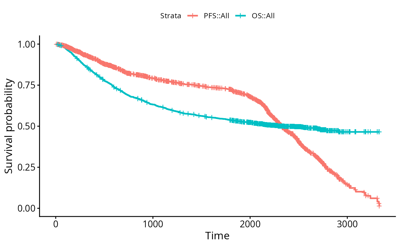 pfs <- survfit( Surv(pfs.time, pfs.status) ~ 1, data = demo.data)