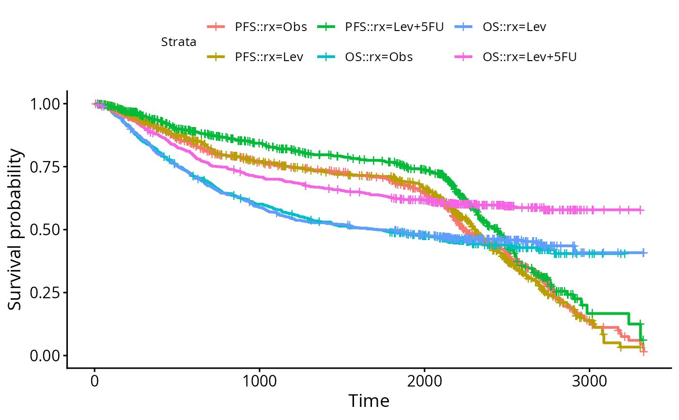 os <- survfit( Surv(os.time, os.status) ~ rx, data = demo.data)