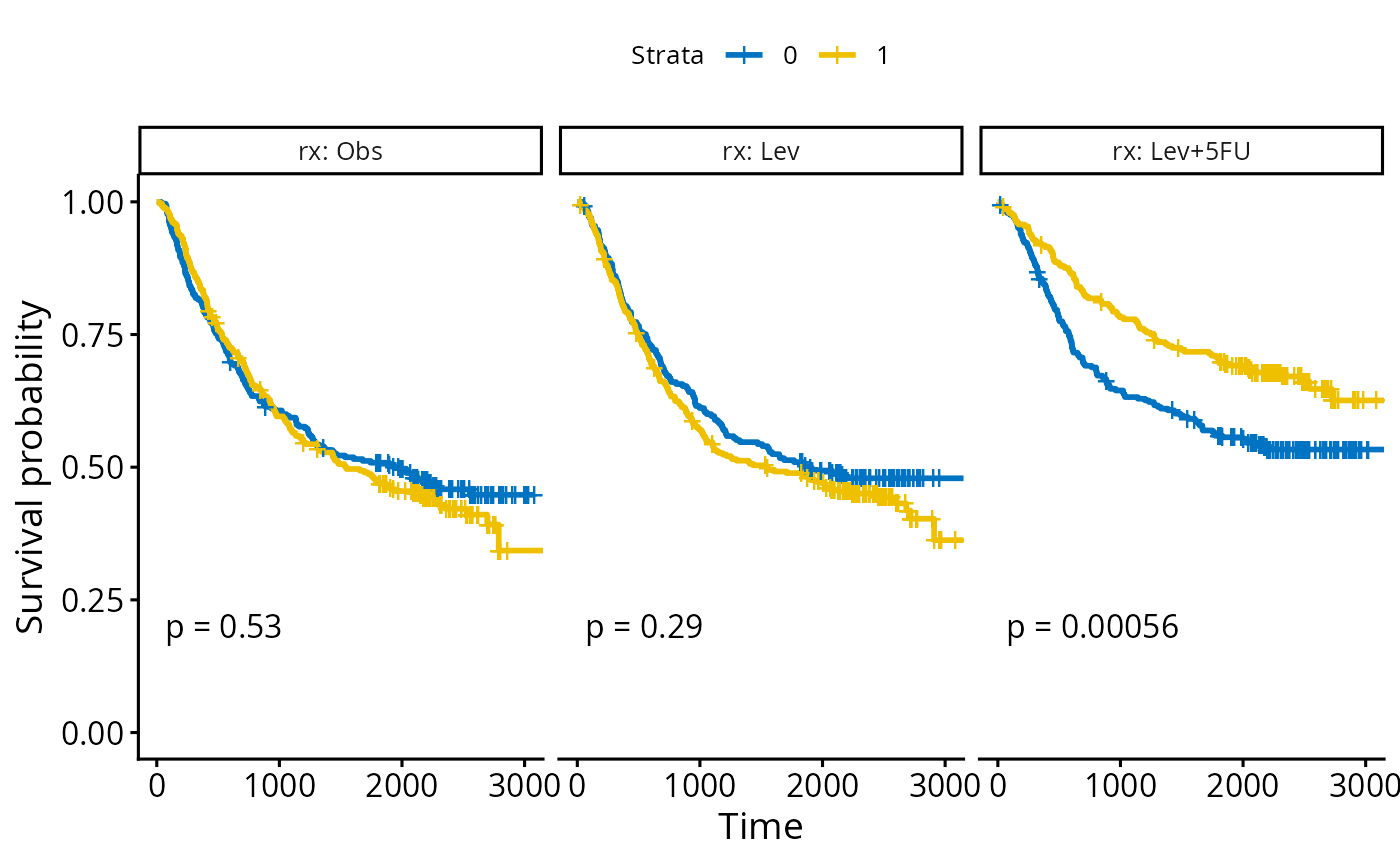 ggsurvplot_facet(fit, colon, facet.by = "rx",