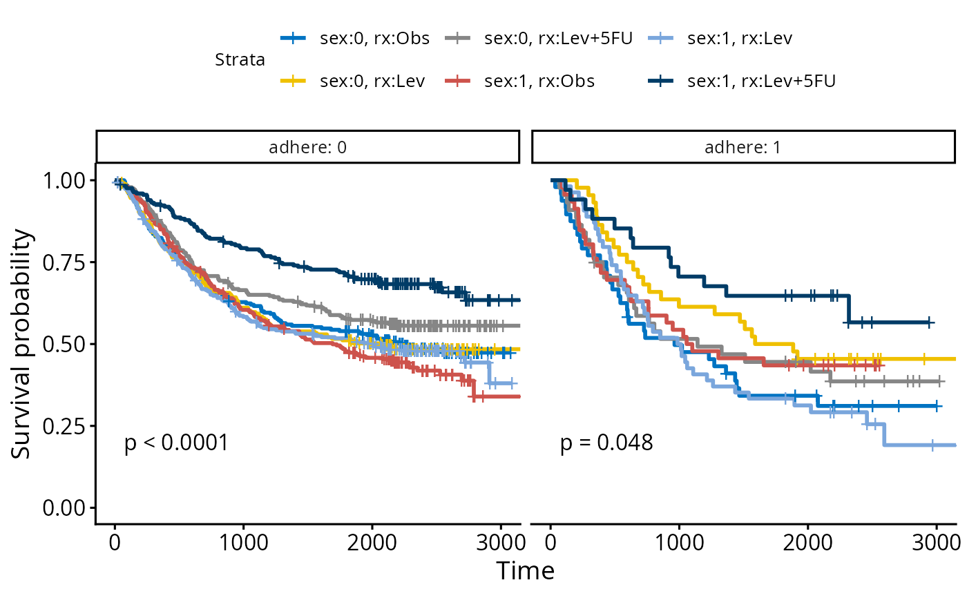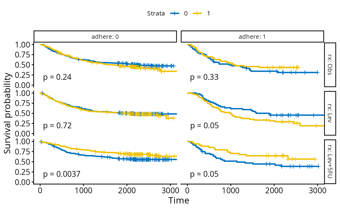 ggsurvplot_facet(fit, colon, facet.by = c("rx", "adhere"),