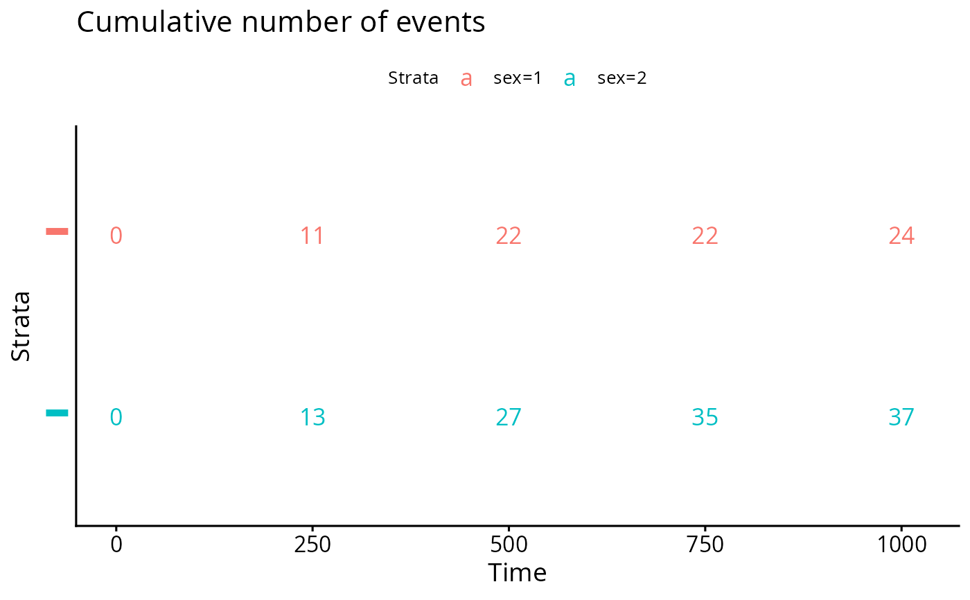 ggrisktable(): Plot the number at risk table.ggcumevents(): Plot the cumulative number of events table.ggcumcensor(): Plot the cumulative number of censored subjects, the number of subjects who exit the risk set, without an event, at time t. Normally, users don't need to use this function directly.ggsurvtable(): Generic function to plot any survival tables.