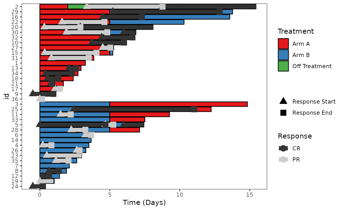swim_plot <-swimmer_plot(df=ClinicalTrial.Arm,id='id',end='End_trt',name_fill='Arm',col="black"