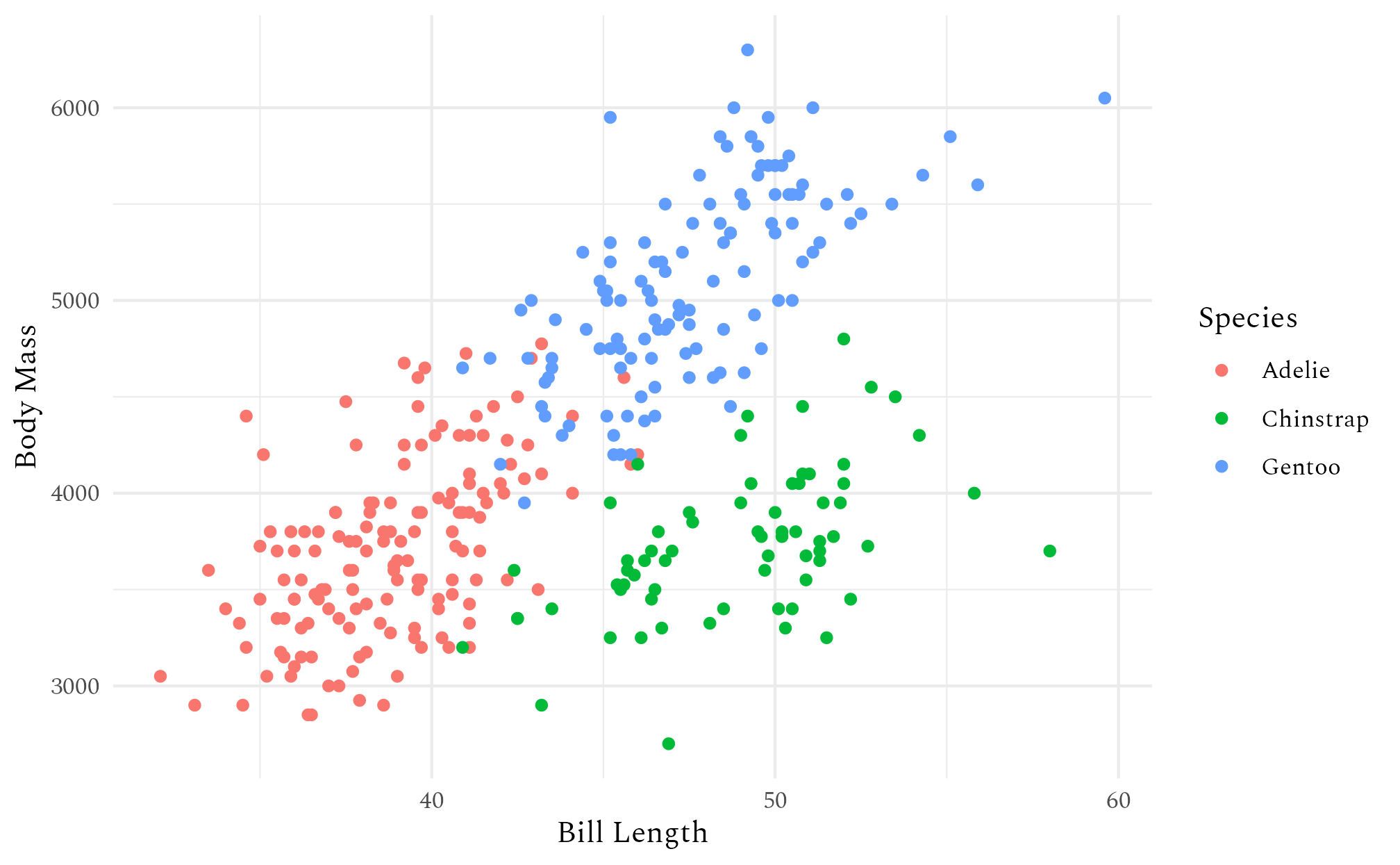 labs(x = "Bill Length", y = "Body Mass", colour = "Species") +